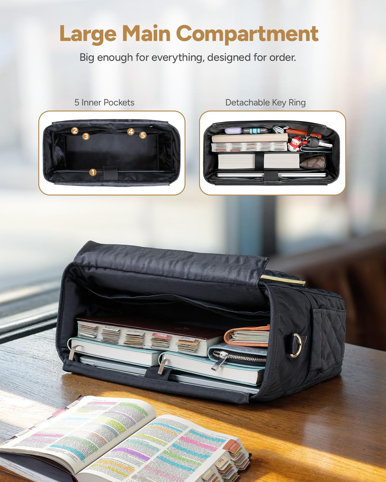 - 【Multi-functional Bible Cover Case】Our Bible Carrier measures 13.4″x 10.6″ x 5.3″, perfect for Bibles, 14” laptops, and 12.9” iPads. It doubles as a briefcase, laptop bag, makeup kit, toiletry bag, and diary organizer.