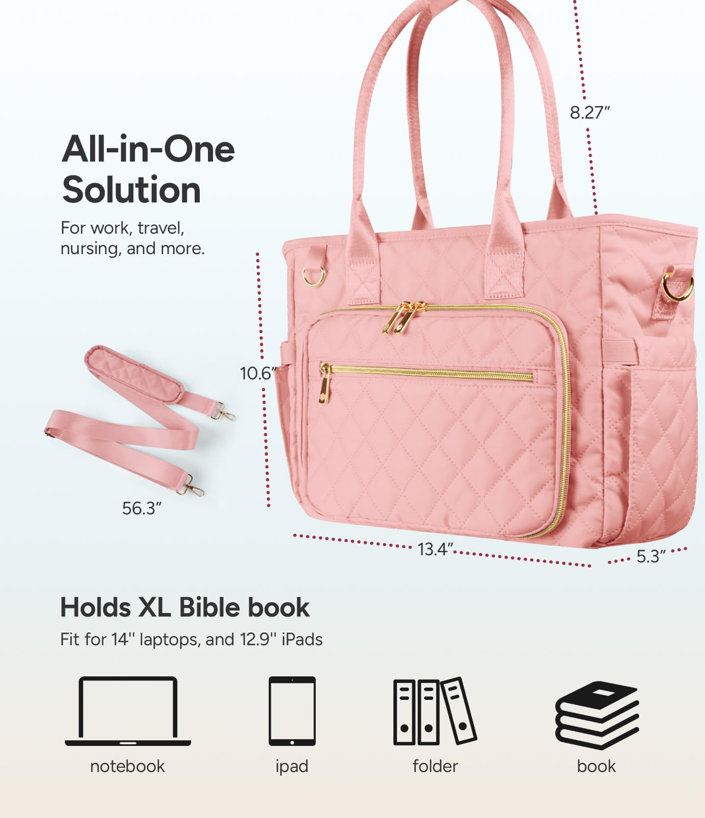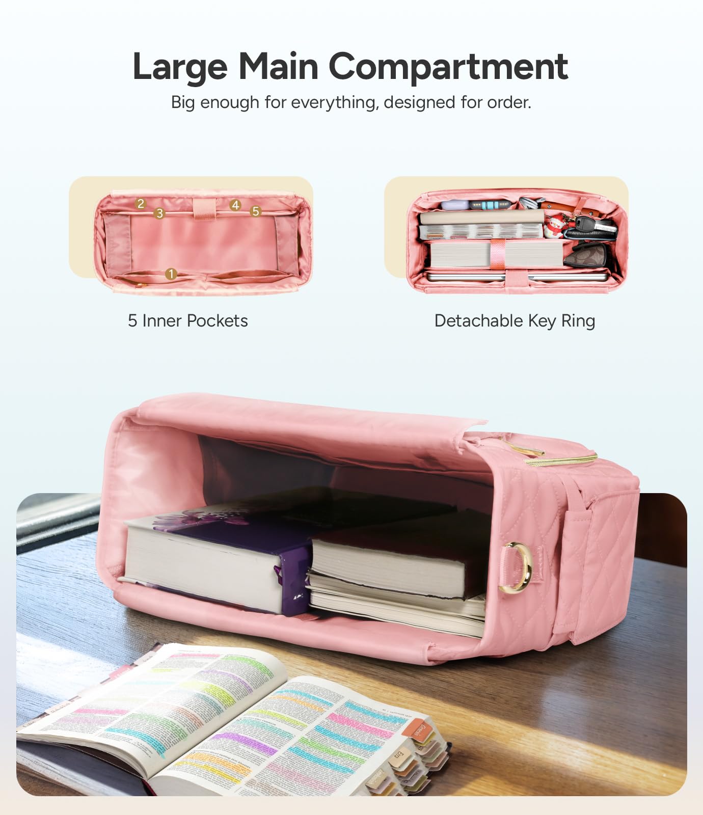 - 【Multi-functional Bible Bag】Our bible bag measures 13.4″x 10.6″ x 5.3″, perfect for Bibles, 14” laptops, and 12.9” iPads. It doubles as a briefcase, laptop bag, makeup kit, toiletry bag, and diary organizer.