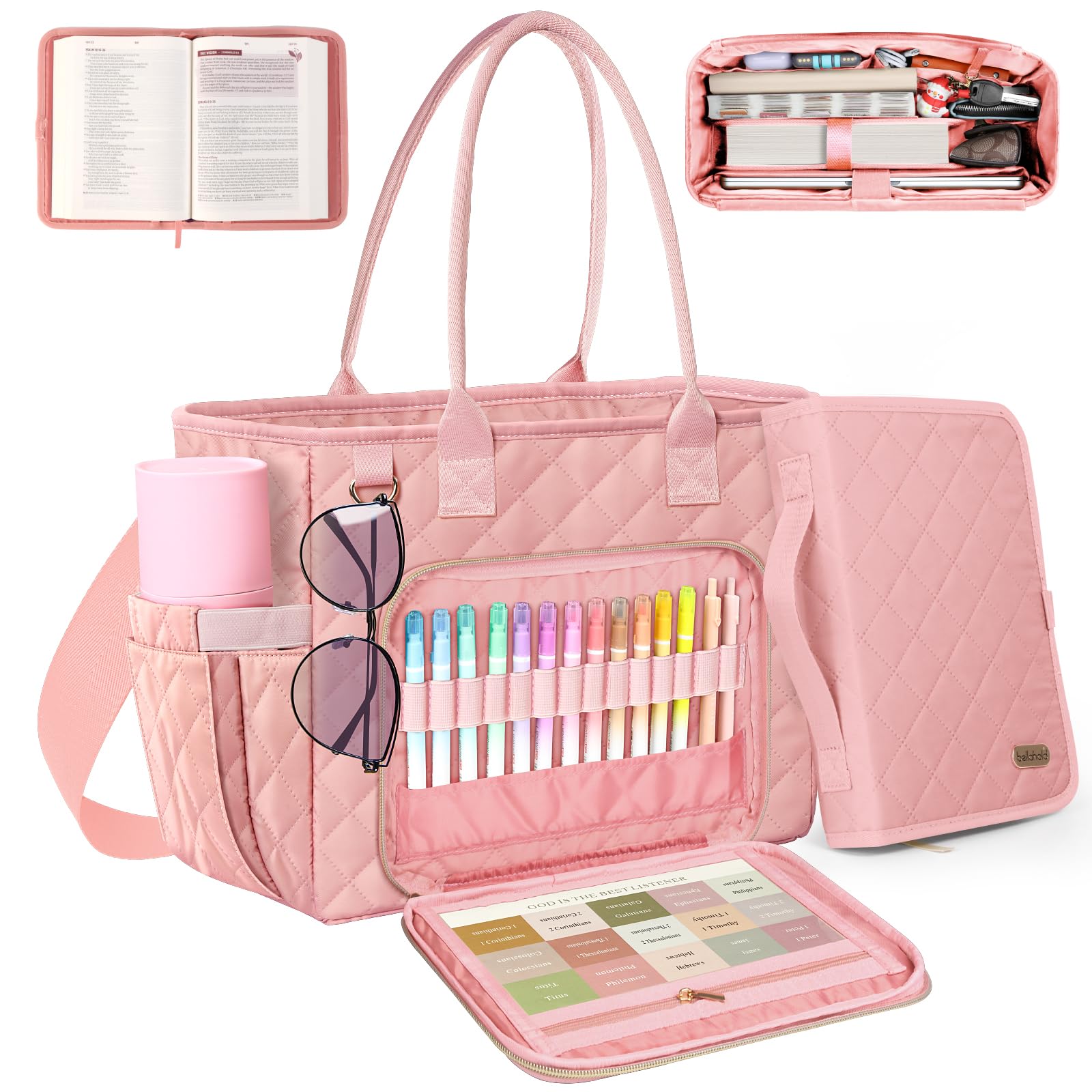 - 【Easy-to-Reach Design】The main compartment features 1 divider and 4 inner pockets for easy organization of your Bible journaling supplies. Side water bottle pockets are designed for beverages, snacks, and umbrellas. The front boasts 2 zippered pockets with transparent compartments and pen holders for up to 14 pens, while the back pocket stores Bible documents and study materials, aiding in your organizational efforts.