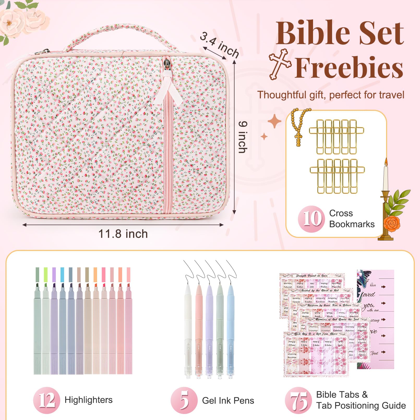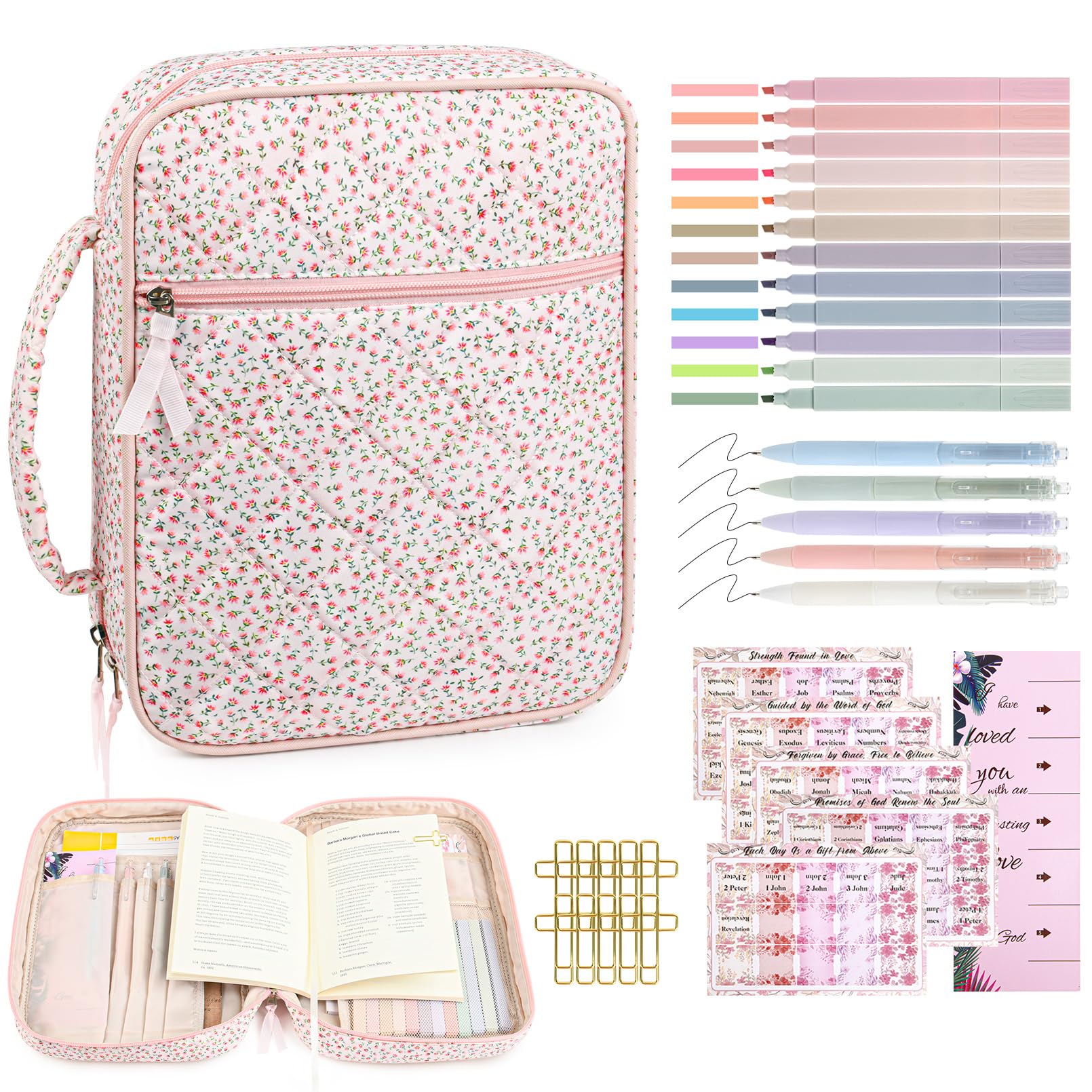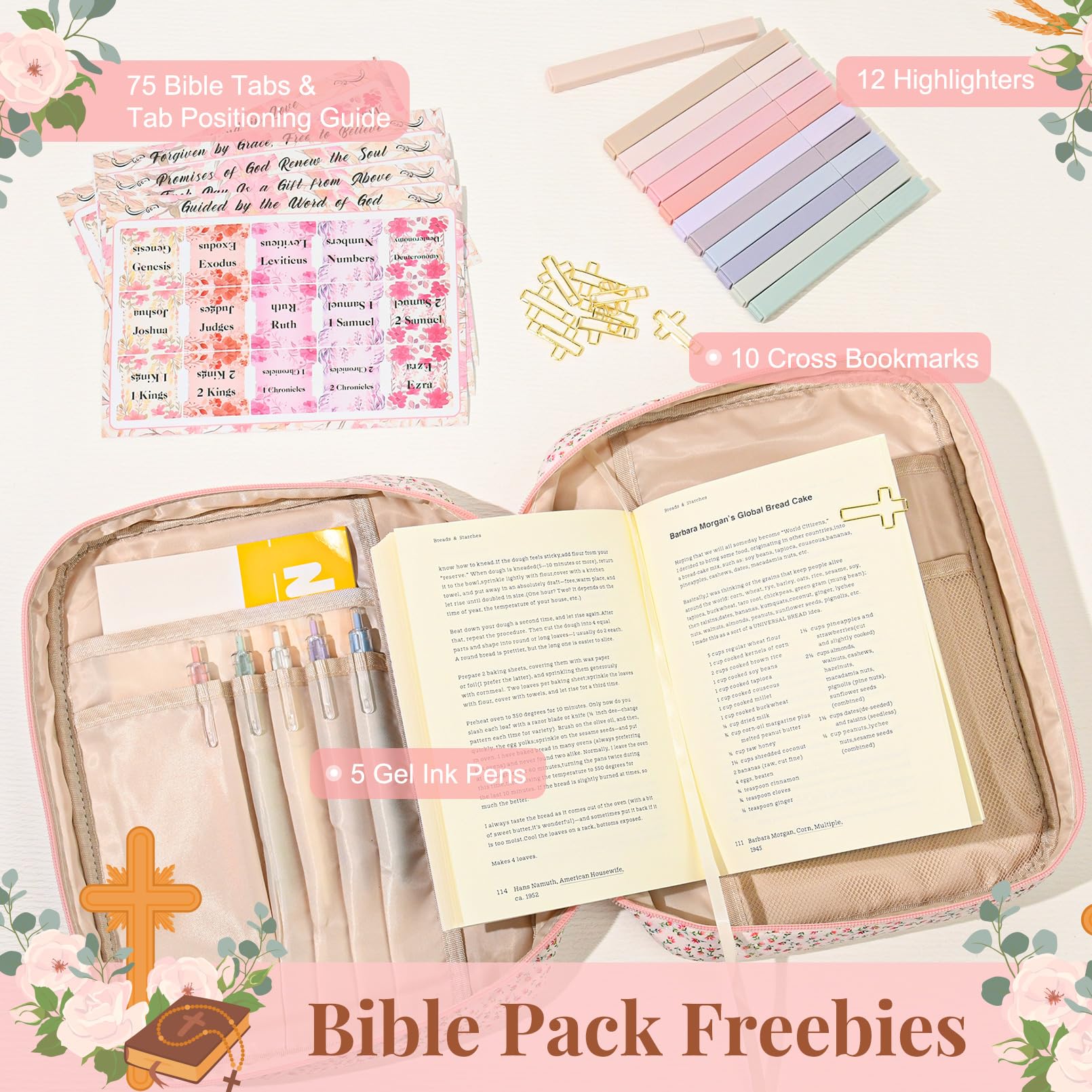 - đź“– All-in-One Bible Study Supplies Set This thoughtfully curated Bible cover case for women includes everything you need for daily scripture reading and journaling: a large protective Bible case, 5 neutral pens, 12 pastel highlighters, 10 cross-shaped bookmarks, 75 Bible book tabs, and a tab positioning guide. Perfect for beginners and seasoned Bible readers alike.