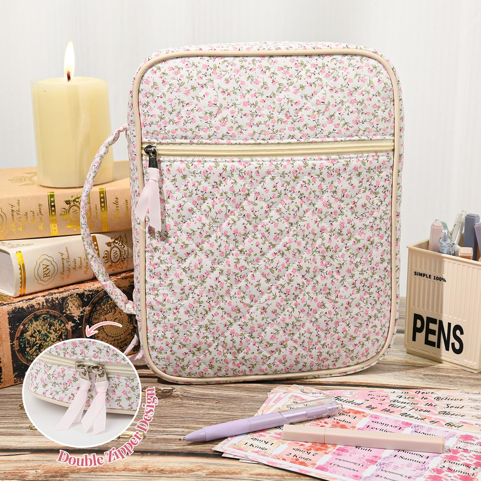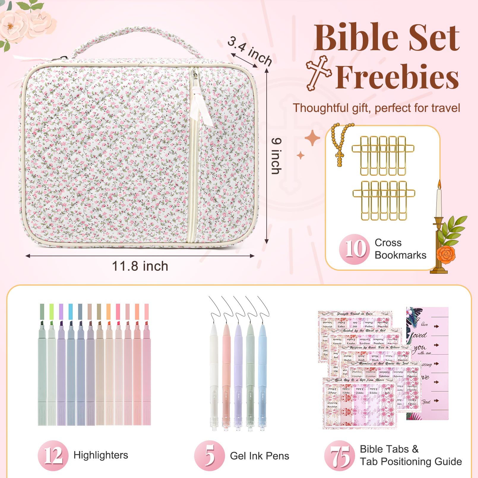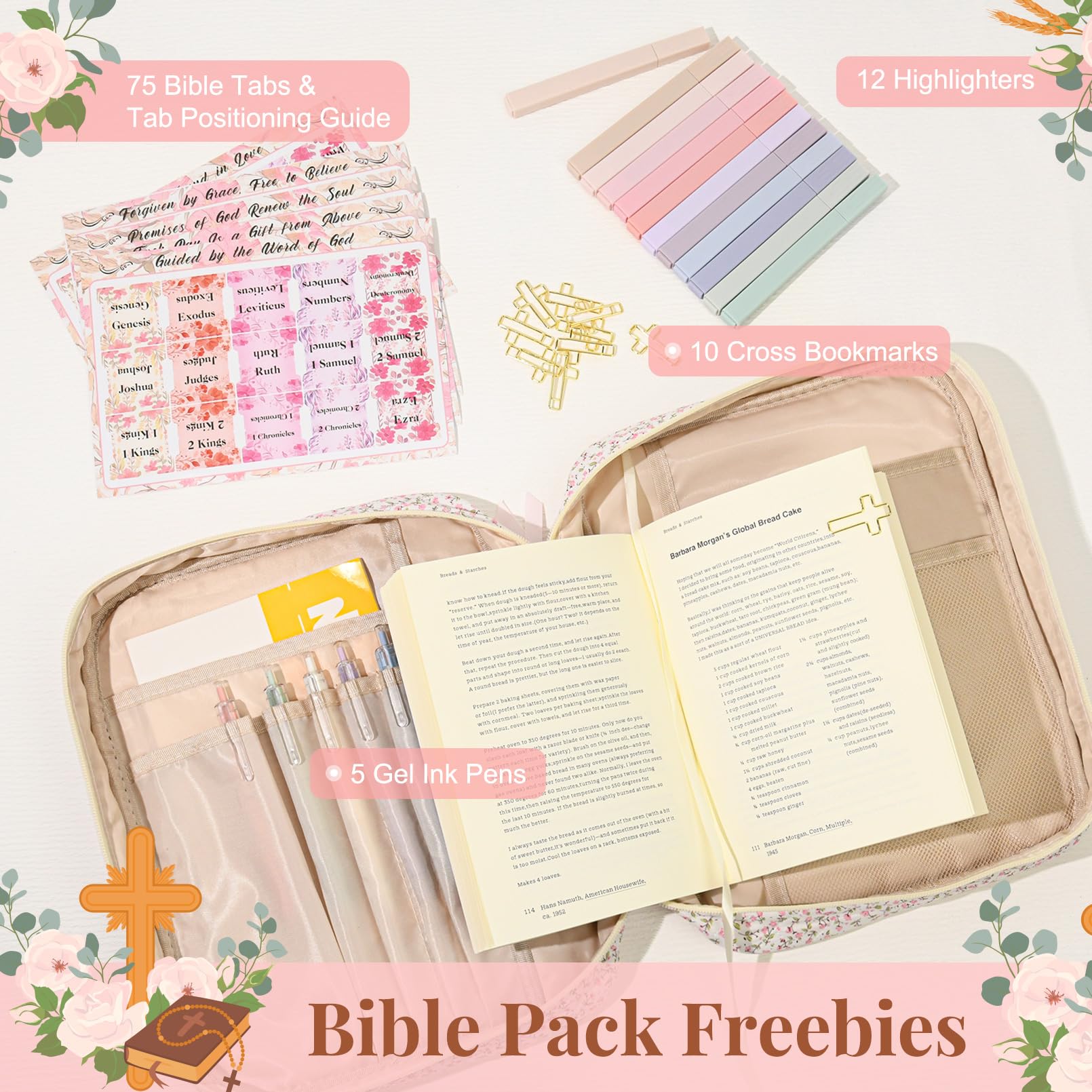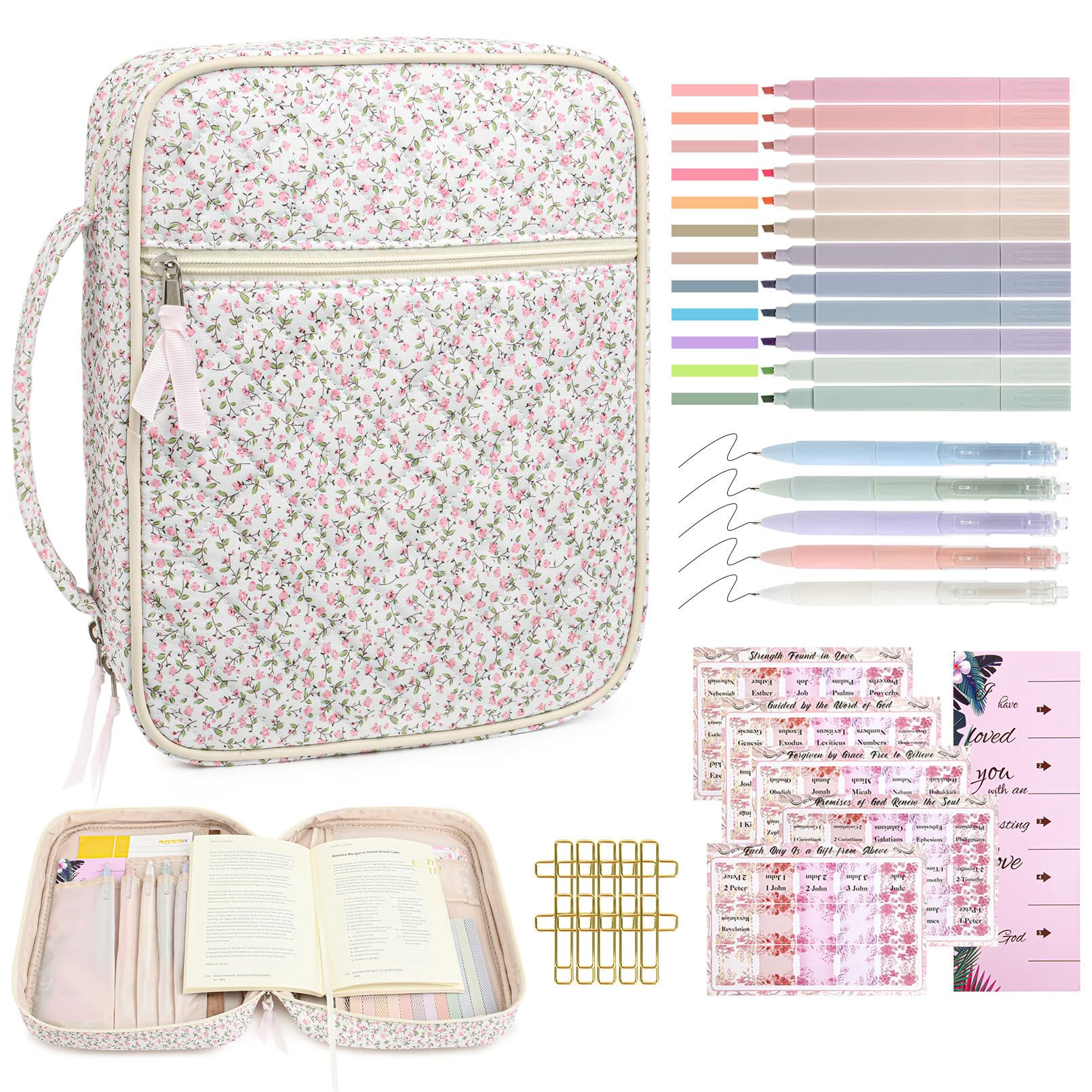 - đź“– All-in-One Bible Study Supplies Set This thoughtfully curated Bible cover case for women includes everything you need for daily scripture reading and journaling: a large protective Bible case, 5 neutral pens, 12 pastel highlighters, 10 cross-shaped bookmarks, 75 Bible book tabs, and a tab positioning guide. Perfect for beginners and seasoned Bible readers alike.