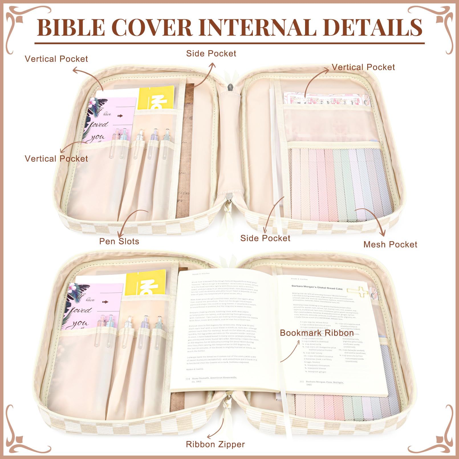 - 🖊️ Organized Interior with Multi-Purpose Pockets Stay organized with inner compartments designed for Bible journaling accessories. Store pens, sticky notes, bookmarks, and notebooks with ease. This bible cover case for women keeps all your study tools in one place for efficient and inspiring devotion time.
