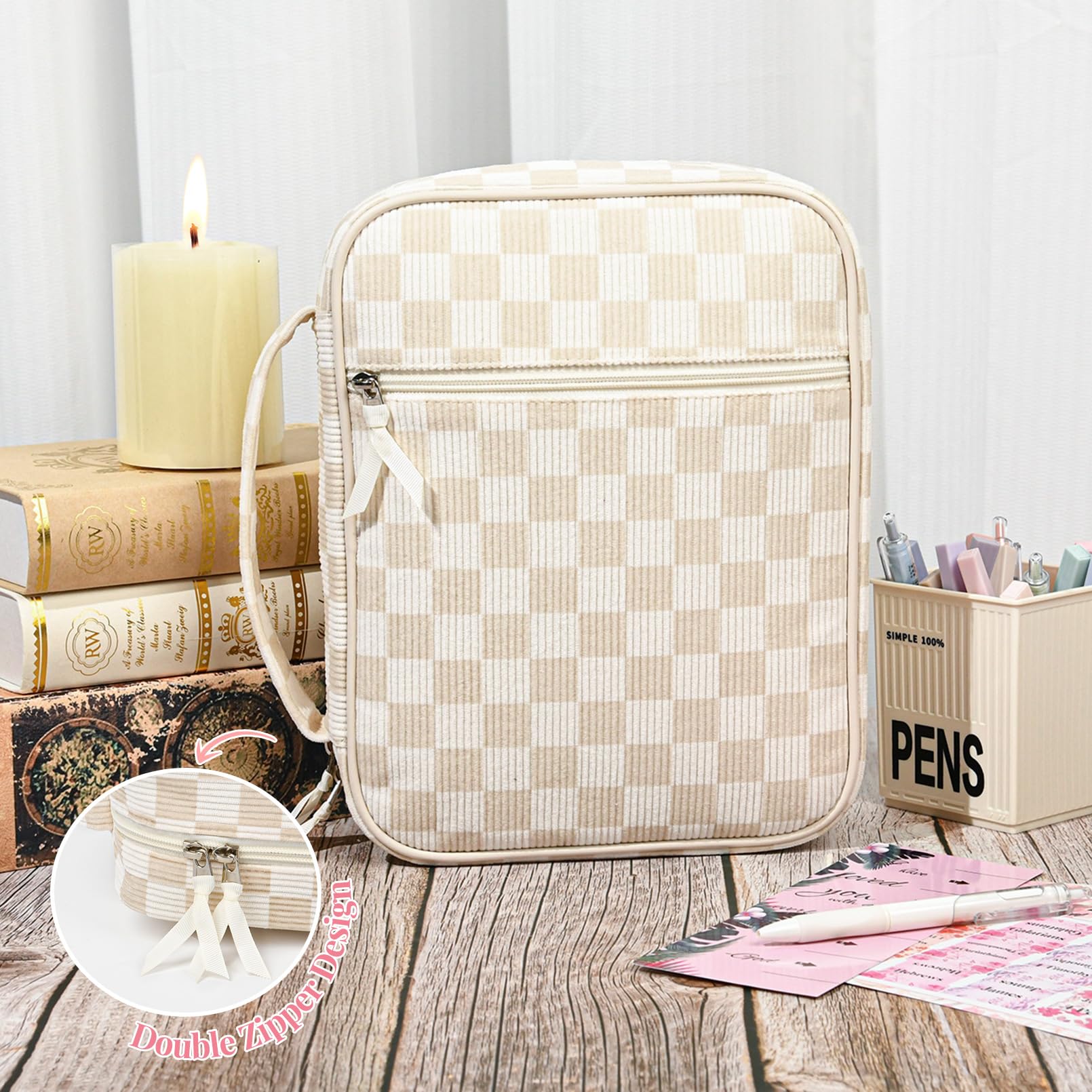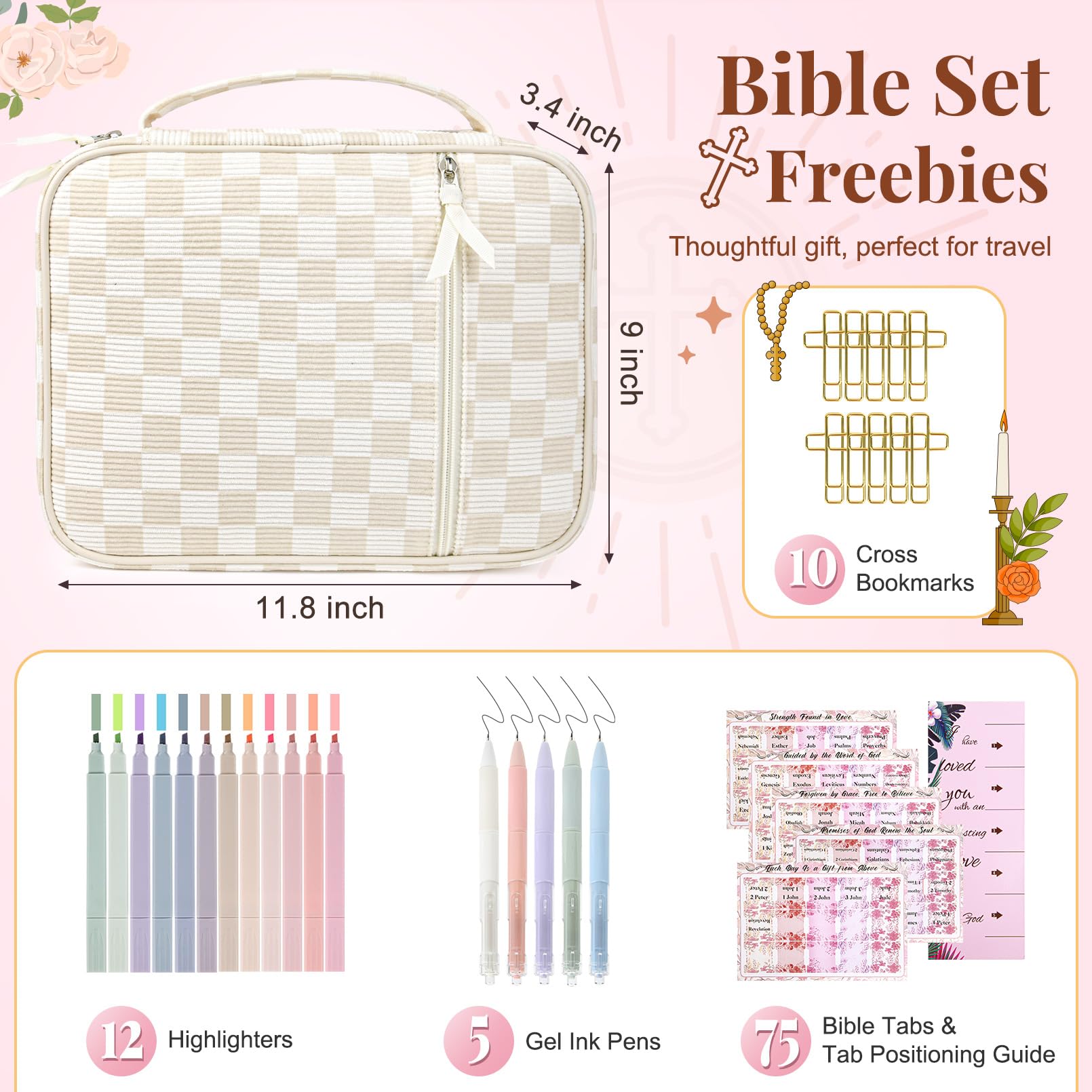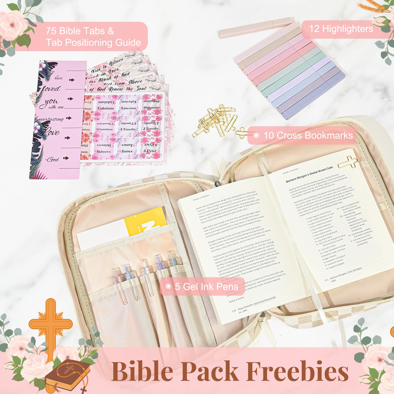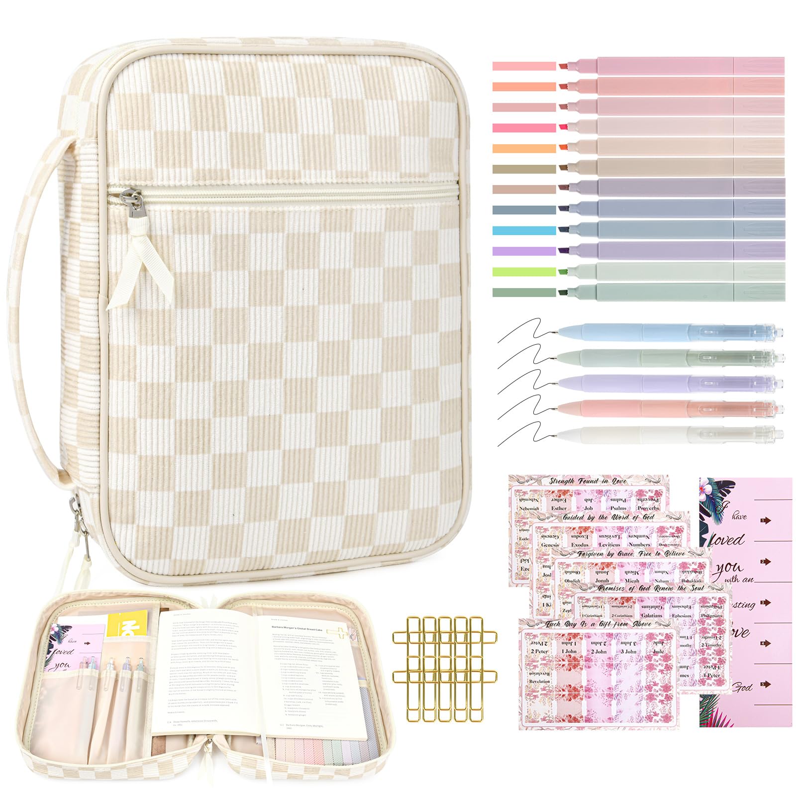 - đź“– All-in-One Bible Study Supplies Set This thoughtfully curated Bible cover case for women includes everything you need for daily scripture reading and journaling: a large protective Bible case, 5 neutral pens, 12 pastel highlighters, 10 cross-shaped bookmarks, 75 Bible book tabs, and a tab positioning guide. Perfect for beginners and seasoned Bible readers alike.
