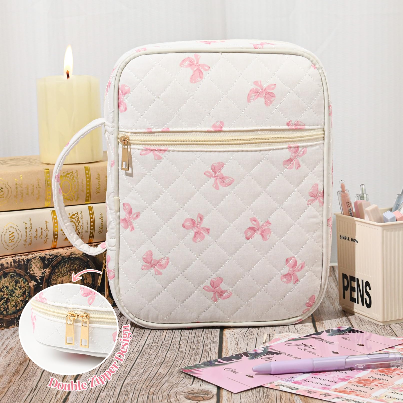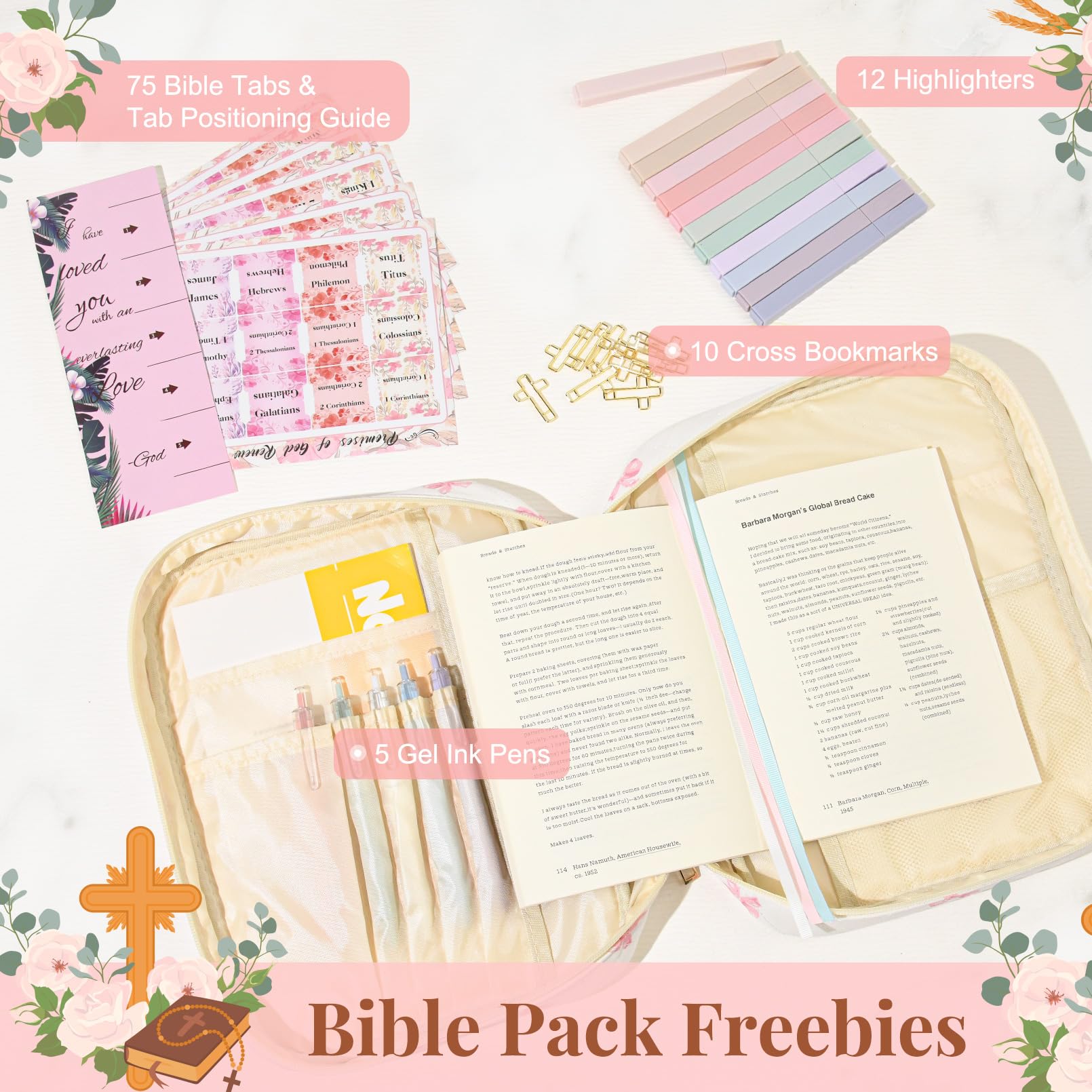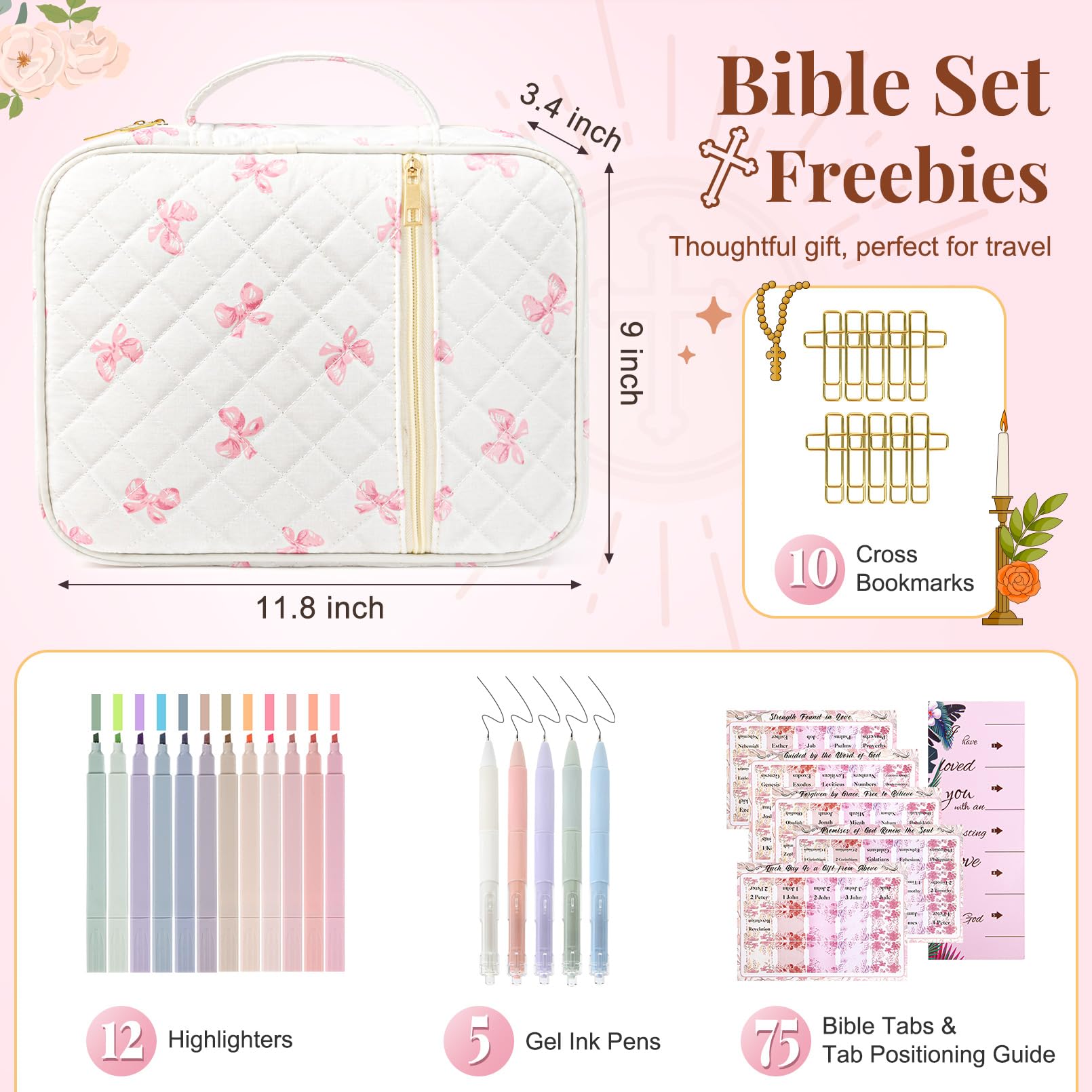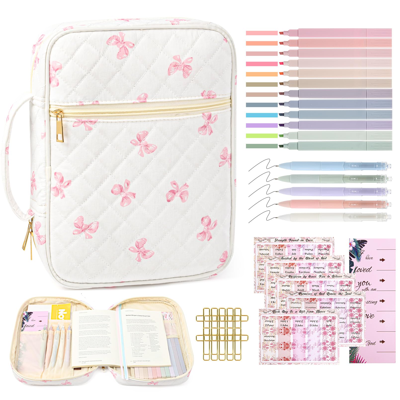 • đź“– All-in-One Bible Study Supplies Set This thoughtfully curated Bible cover case for women includes everything you need for daily scripture reading and journaling: a large protective Bible case, 5 neutral pens, 12 pastel highlighters, 10 cross-shaped bookmarks, 75 Bible book tabs, and a tab positioning guide. Perfect for beginners and seasoned Bible readers alike.