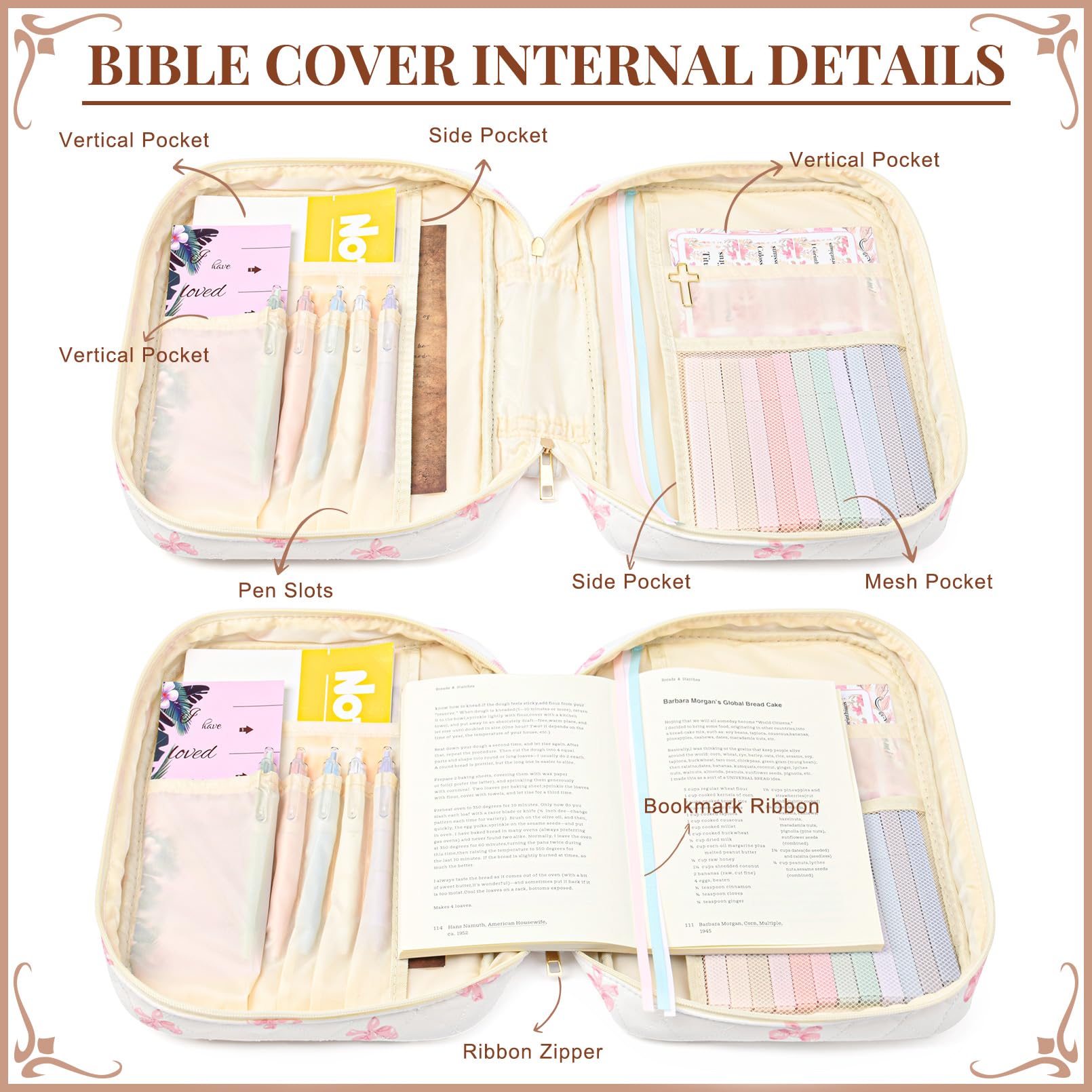 • 🖊️ Organized Interior with Multi-Purpose Pockets Stay organized with inner compartments designed for Bible journaling accessories. Store pens, sticky notes, bookmarks, and notebooks with ease. This bible cover case for women keeps all your study tools in one place for efficient and inspiring devotion time.