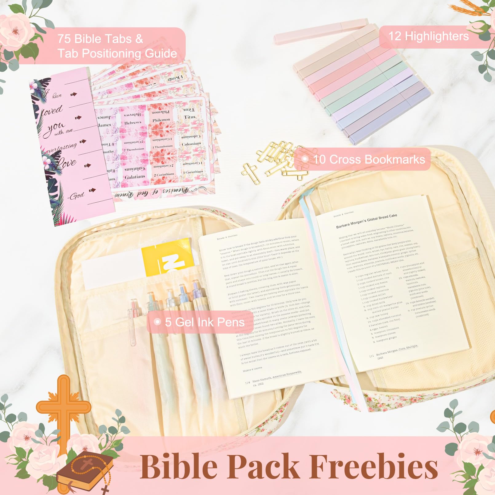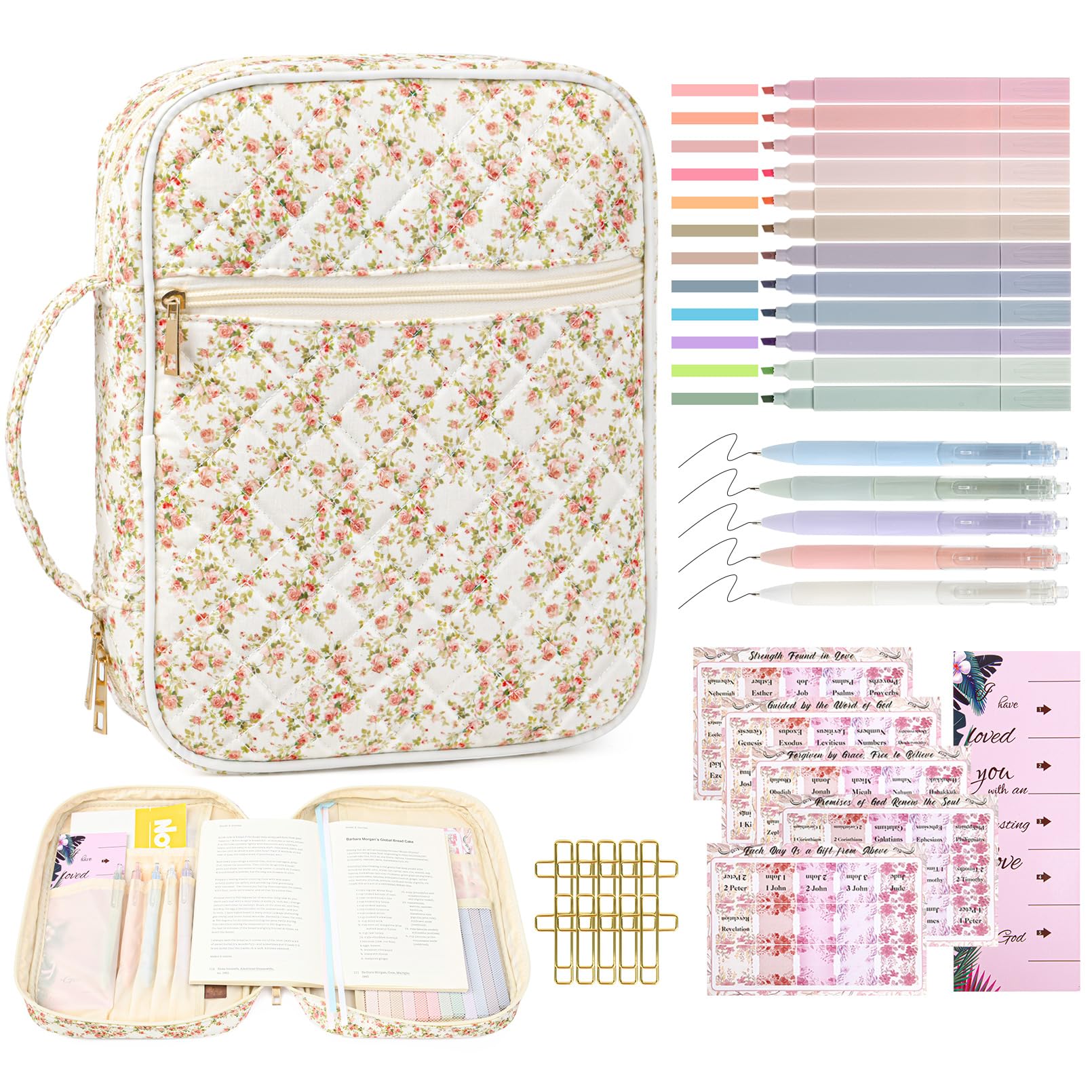 - đź“– All-in-One Bible Study Supplies Set This thoughtfully curated Bible cover case for women includes everything you need for daily scripture reading and journaling: a large protective Bible case, 5 neutral pens, 12 pastel highlighters, 10 cross-shaped bookmarks, 75 Bible book tabs, and a tab positioning guide. Perfect for beginners and seasoned Bible readers alike.