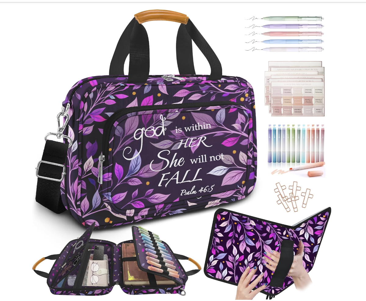 - Along with the Bible cover case, you’ll also get 12 highlighters, 5 black gel pens, 75 Bible tabs, 1 tab positioning guide,and 5 cross paper clips. Moreover, the inner bible holder is detachable,On the spine of the bible cover there is a elastic band handle which works for all hand sizes, and you can hold the whole bible with only one hand.