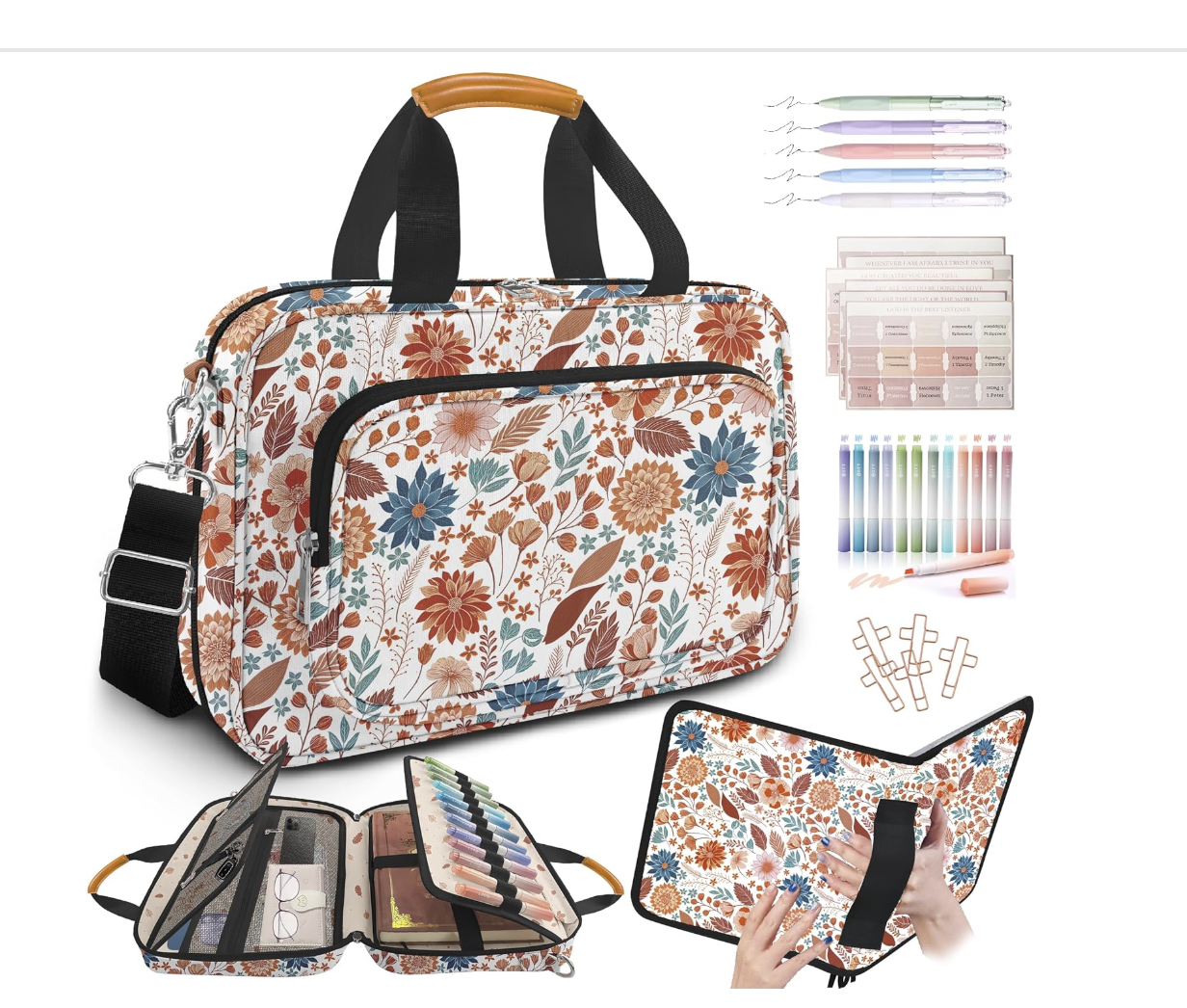 Bible Cover Case for Women,Bible Carrier,Floral Print Bible Bags for Women Organizer,Bible Holder Case with Shoulder Strap,Handle,Bible Study Supplies Kit with Highlighters,Tabs,Pens,Christian Gif