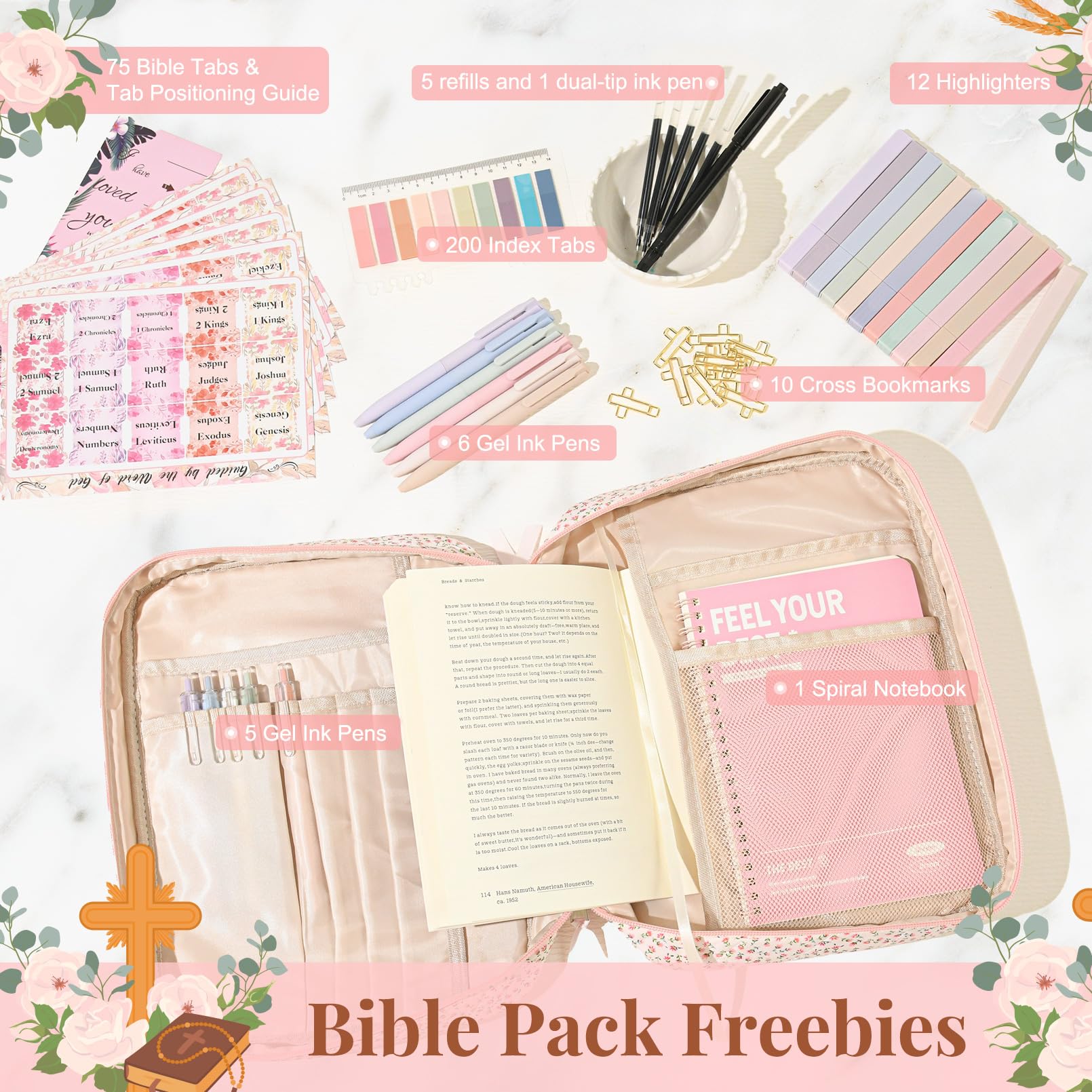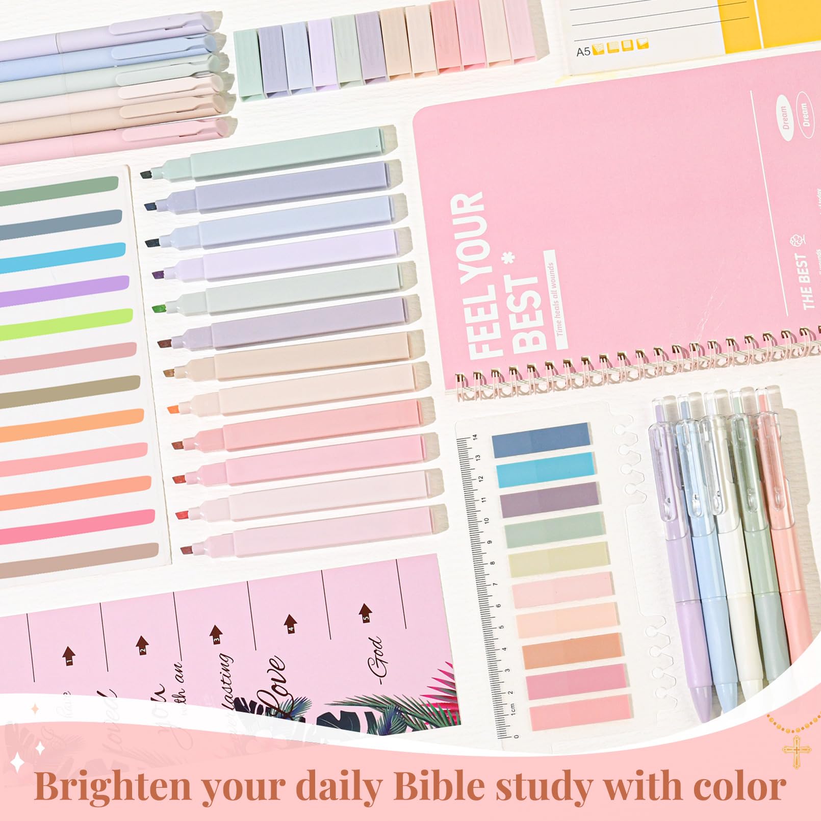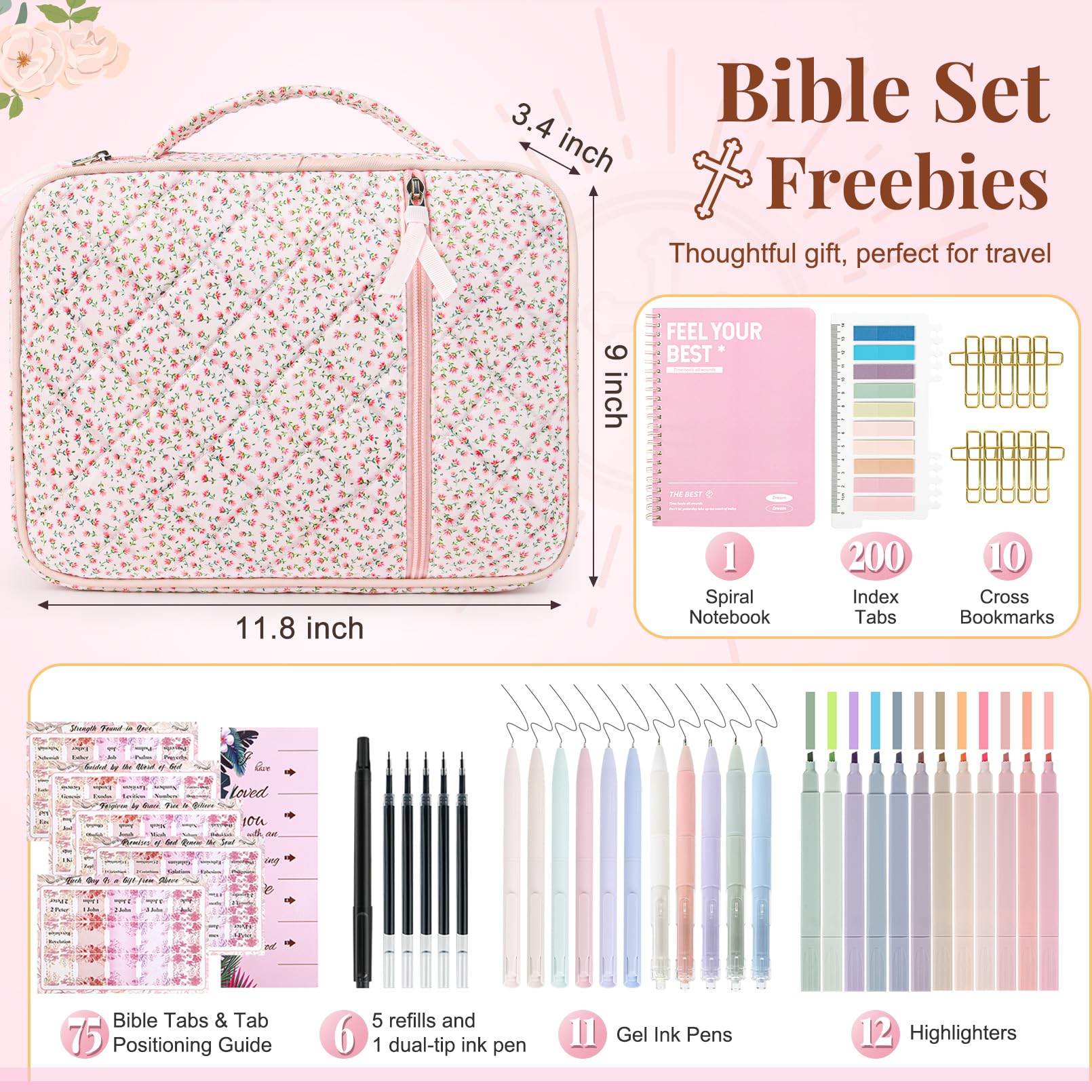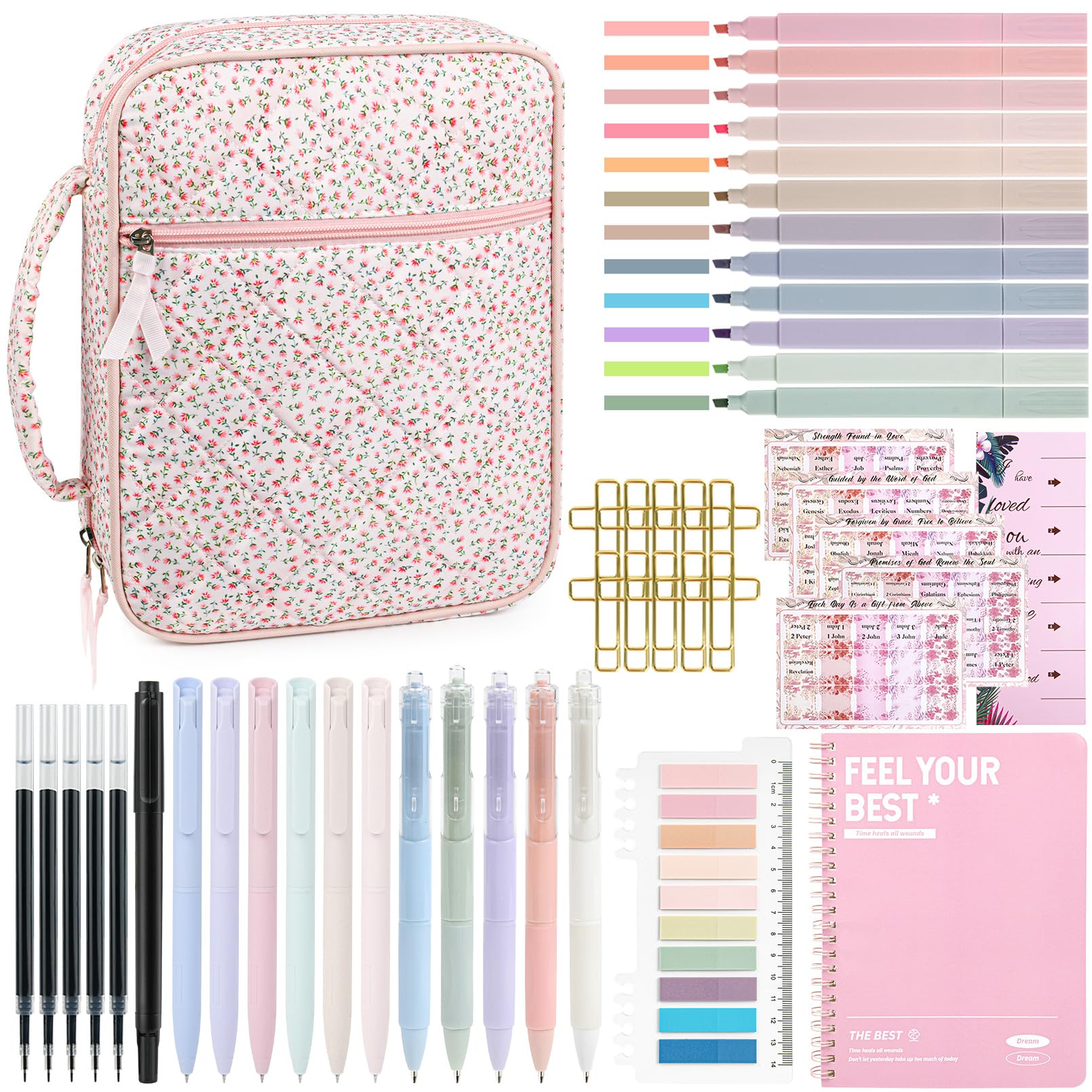 - đź“– Complete Bible Study Supplies Set This upgraded Bible study kit includes everything you need for an inspiring devotional time: 1 large Bible cover bag, 12 pastel highlighters, 11 gel pens, 5 extra refills, 1 fun novelty pen, 1 Bible notebook, 75 preprinted Bible book tabs with a positioning guide, 200 index tabs, and 10 cross bookmarks. Perfect for gifting or personal use.