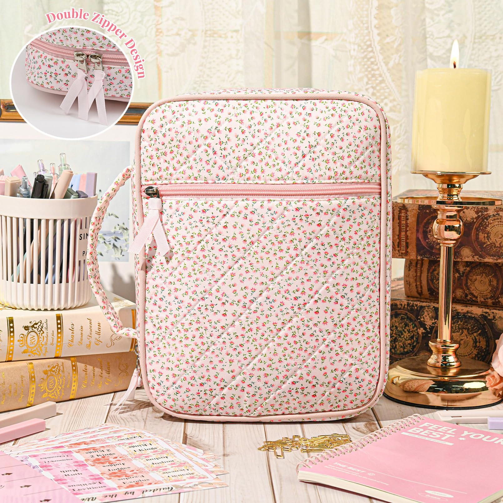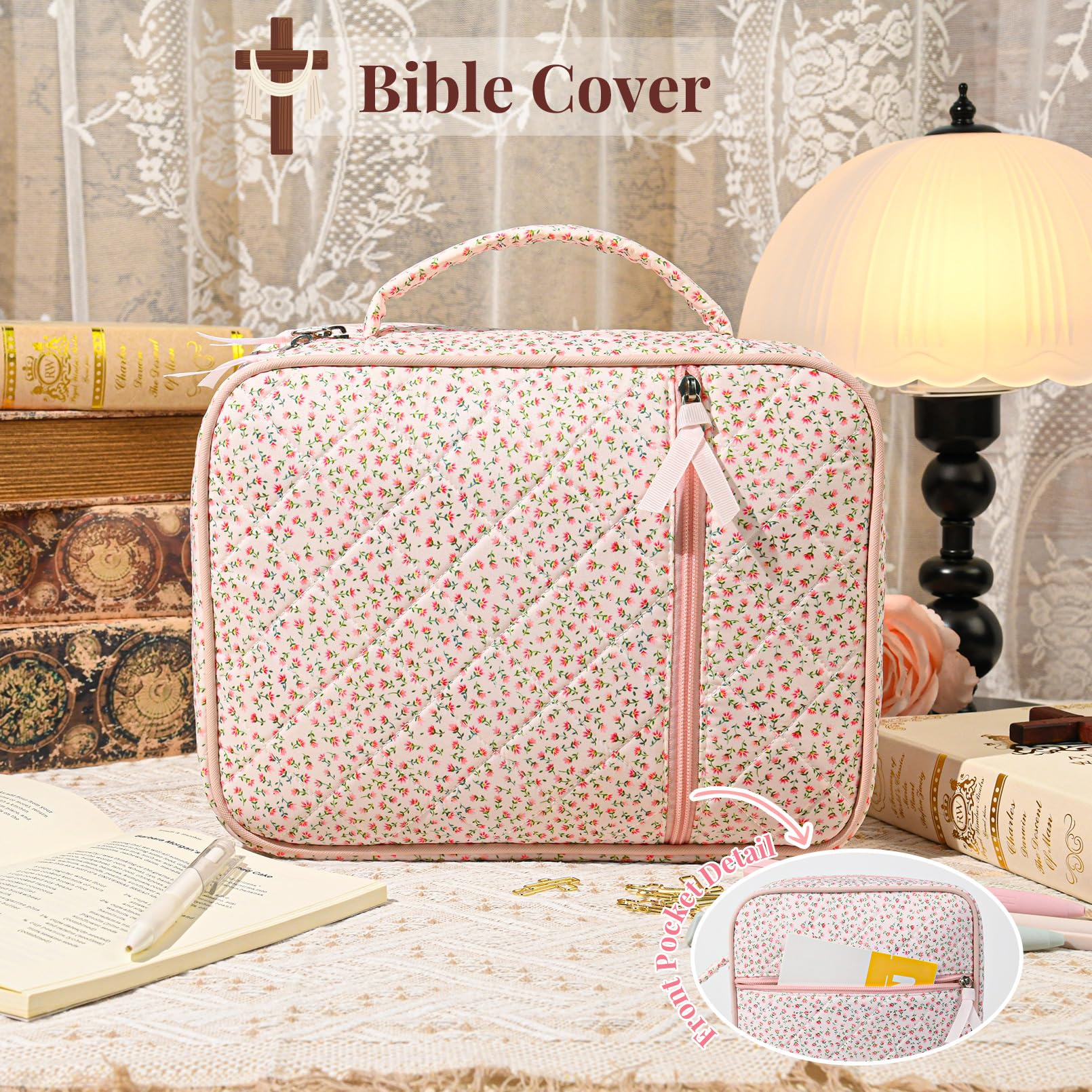 - 🖊️ Built-In Storage & Organization Inside pockets and compartments keep your study tools neat and accessible. Easily organize your pens, highlighters, notebook, bookmarks, and tabs, so everything stays in one place and ready for devotion time.