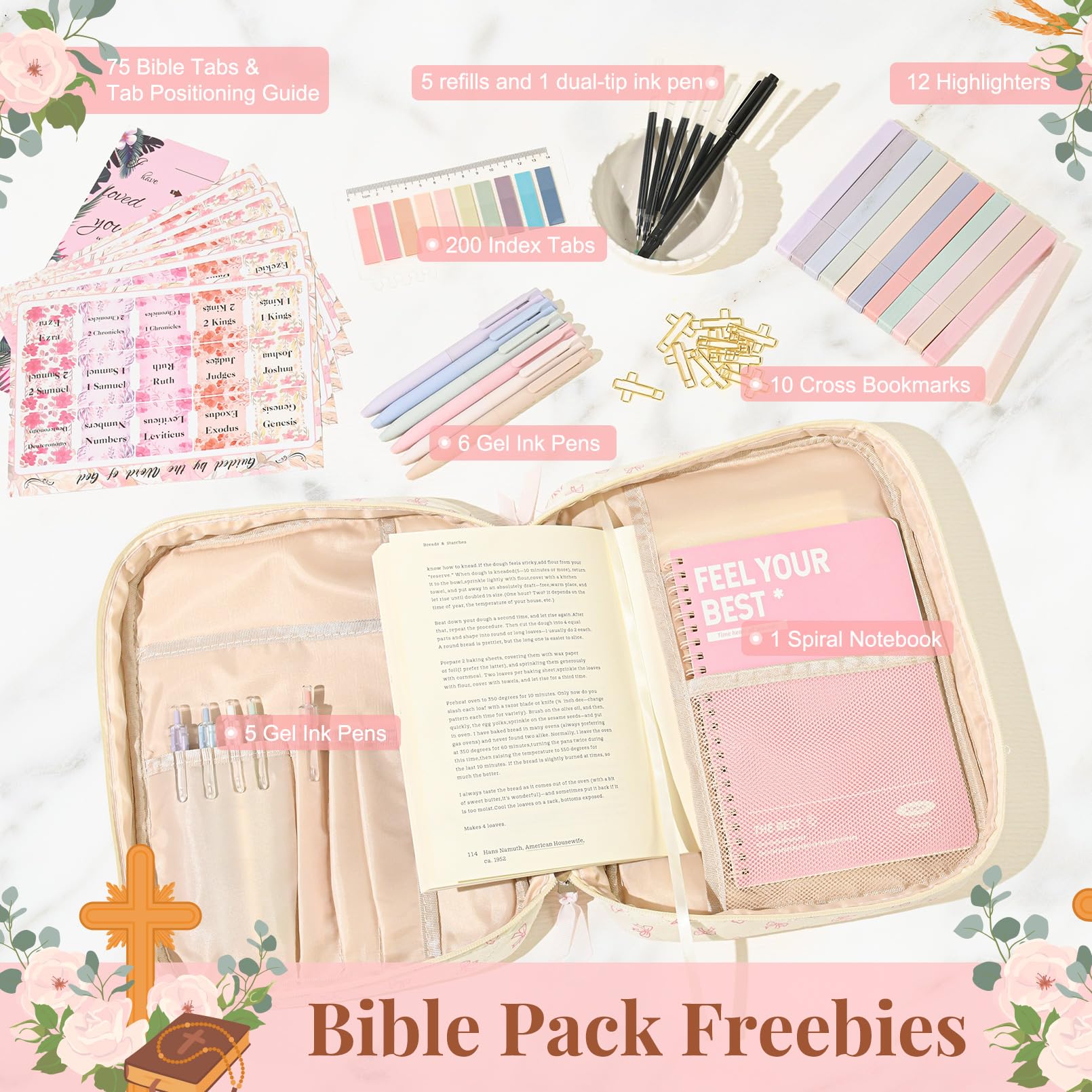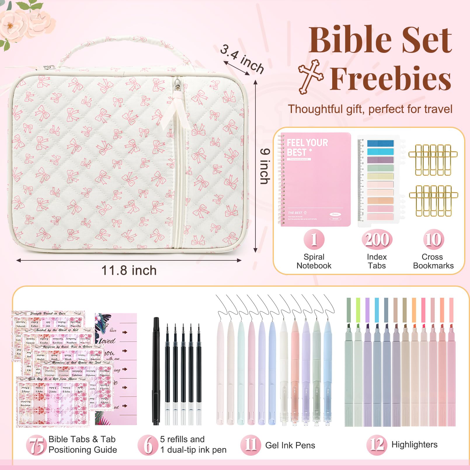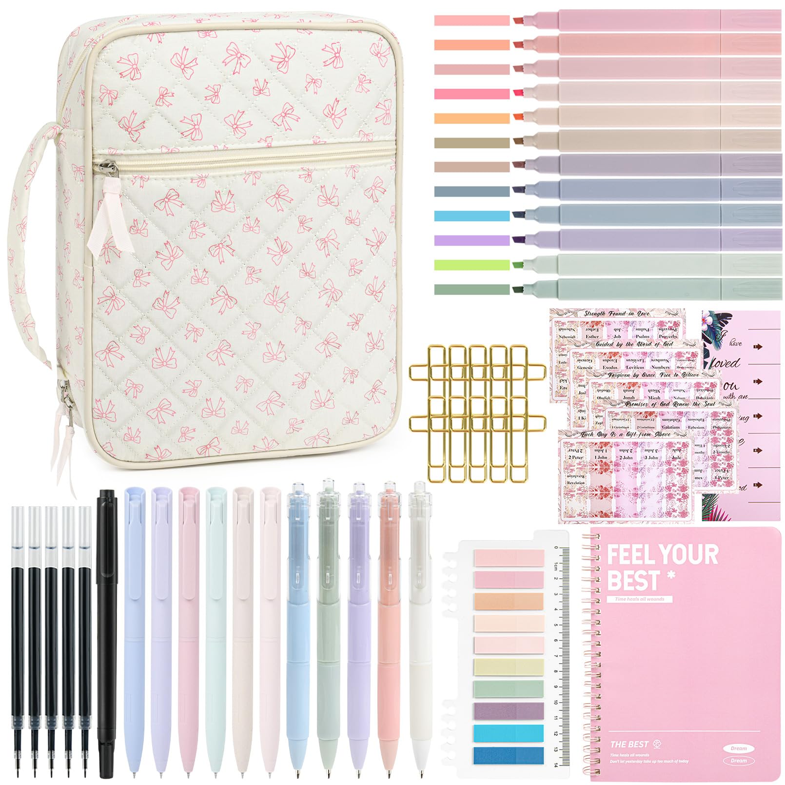 - đź“– Complete Bible Study Supplies Set This upgraded Bible study kit includes everything you need for an inspiring devotional time: 1 large Bible cover bag, 12 pastel highlighters, 11 gel pens, 5 extra refills, 1 fun novelty pen, 1 Bible notebook, 75 preprinted Bible book tabs with a positioning guide, 200 index tabs, and 10 cross bookmarks. Perfect for gifting or personal use.