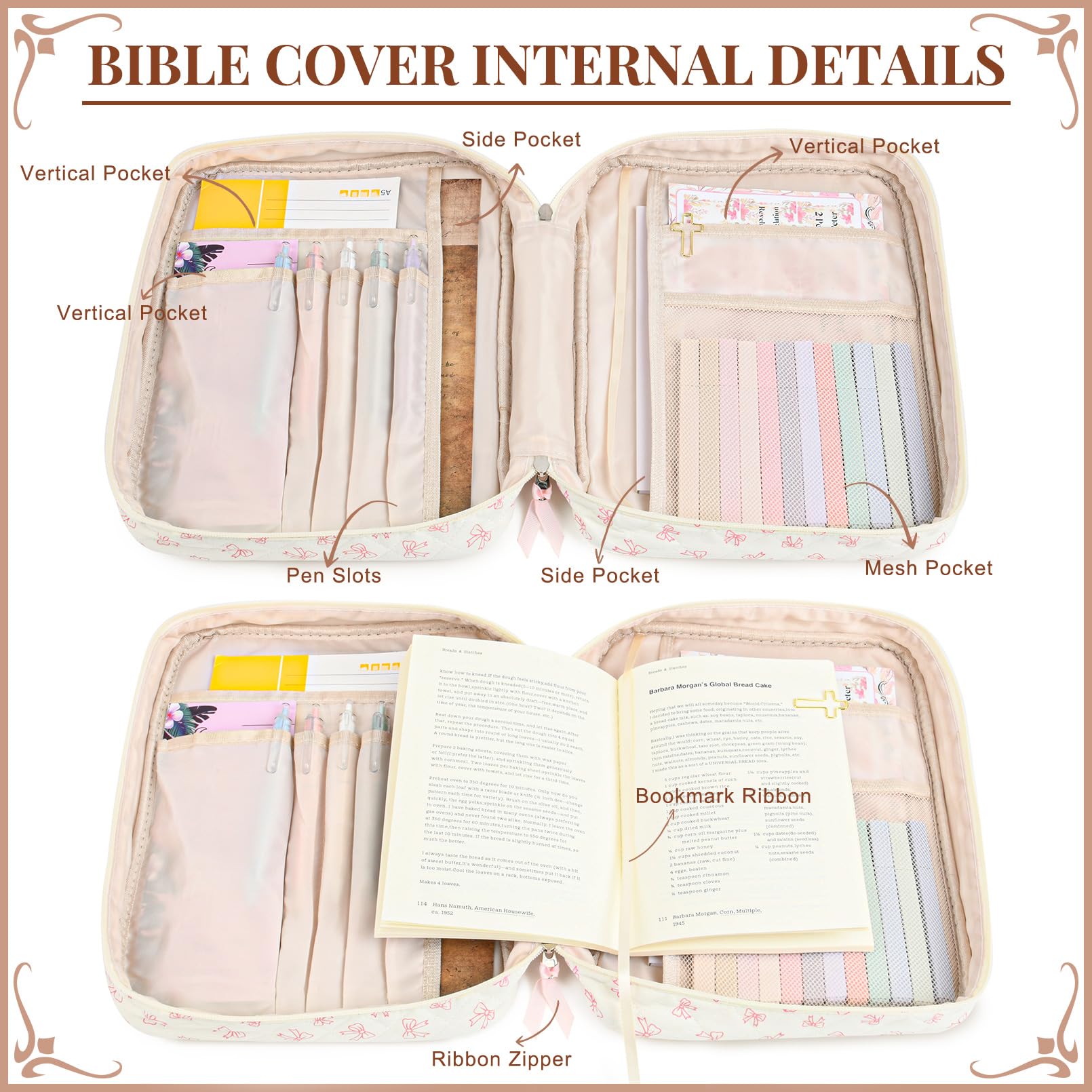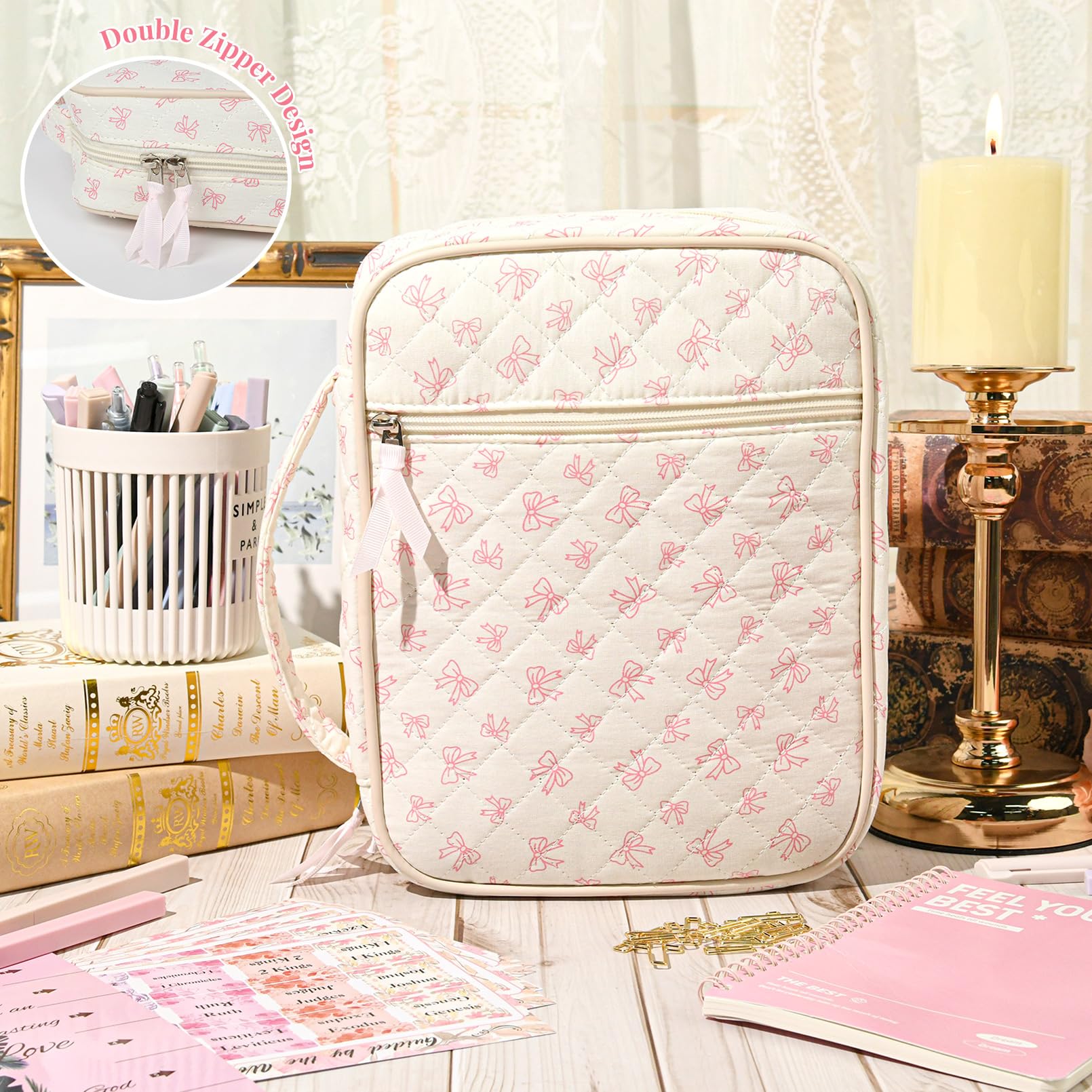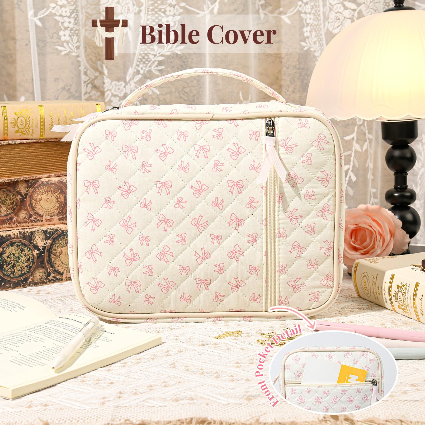 - 🖊️ Built-In Storage & Organization Inside pockets and compartments keep your study tools neat and accessible. Easily organize your pens, highlighters, notebook, bookmarks, and tabs, so everything stays in one place and ready for devotion time.