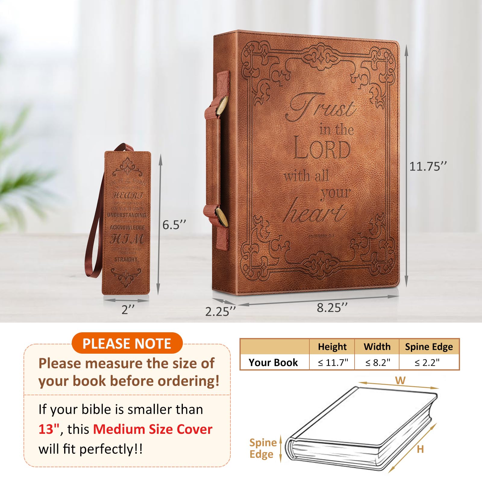 - Large Size Cover: 11.75″ x 8.25″ x 2.25″. Perfect for standard or smaller than 13″ Bible/Book/Notebook. Note that Amazon specifications are exterior Bible cover dimensions, please allow extra room to avoid a too snug fit. (NOTE: Please measure the size of your book before ordering!)