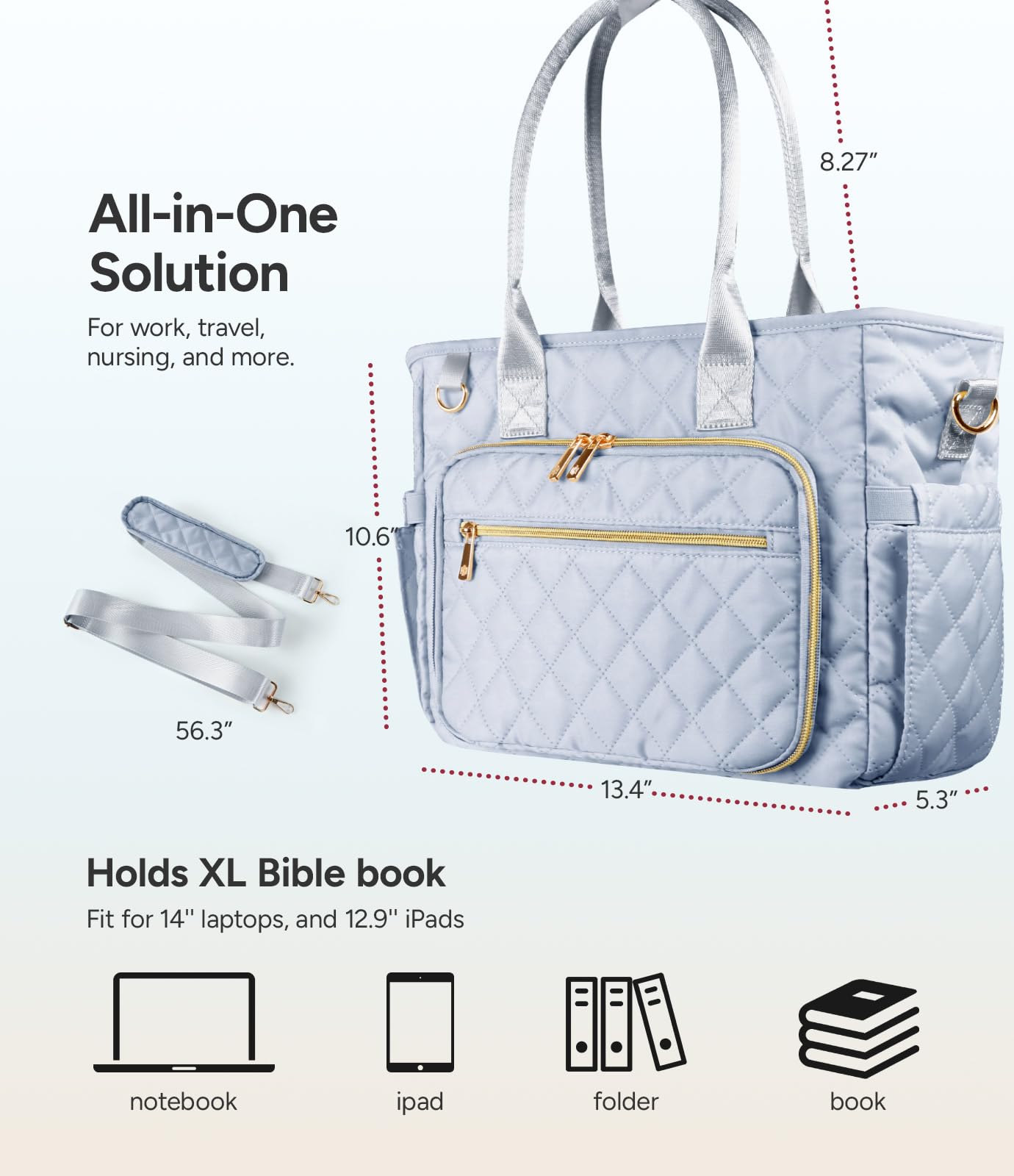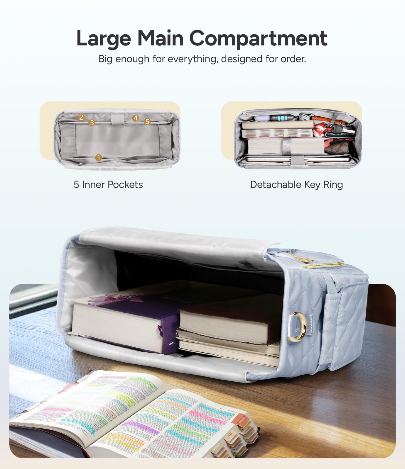 - 【Multi-functional Bible Cover Case】Our Bible Carrier measures 13.4″x 10.6″ x 5.3″, perfect for Bibles, 14” laptops, and 12.9” iPads. It doubles as a briefcase, laptop bag, makeup kit, toiletry bag, and diary organizer.