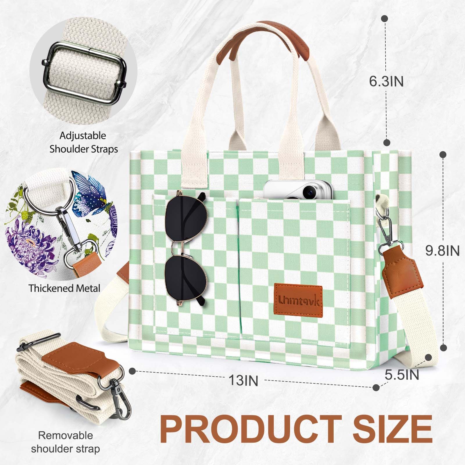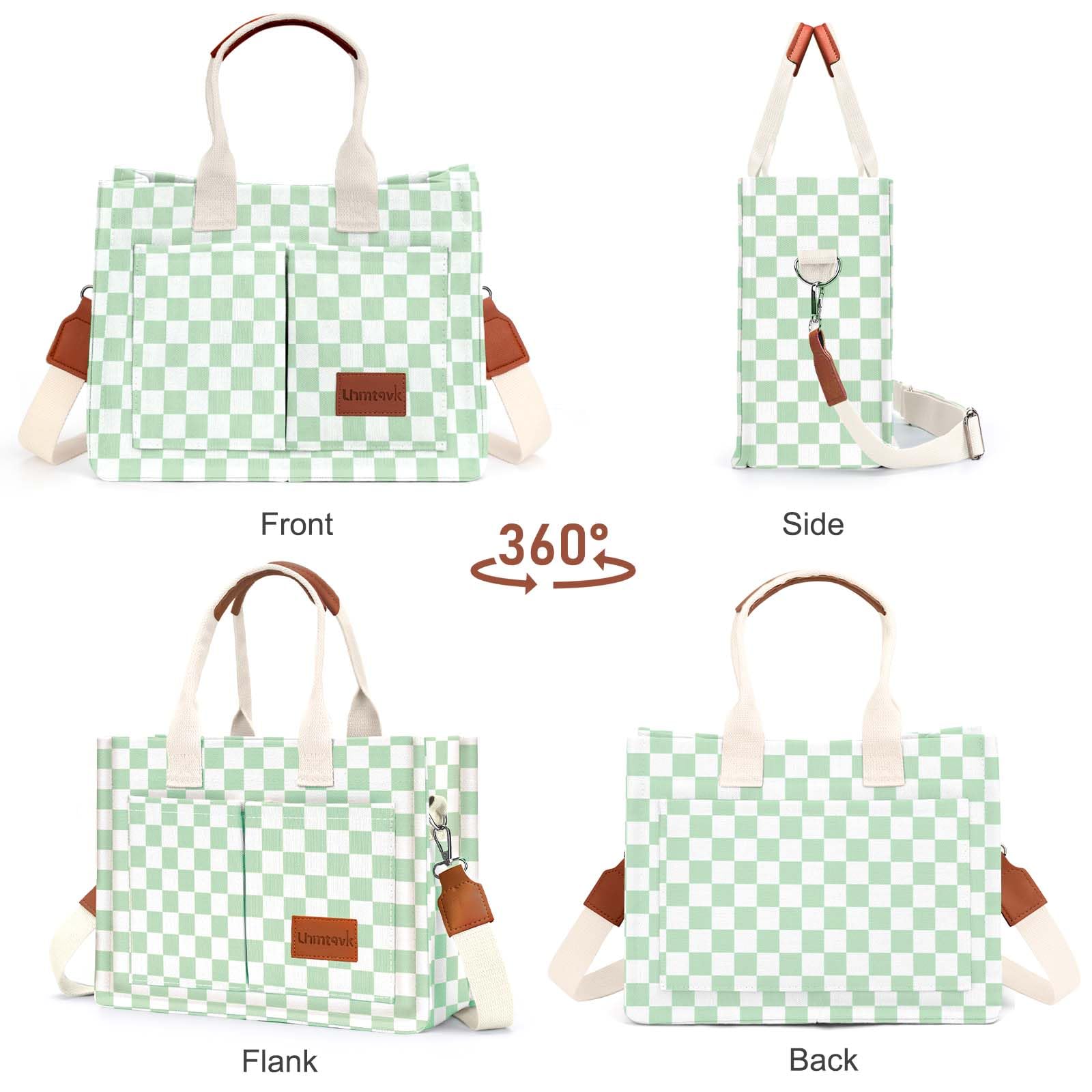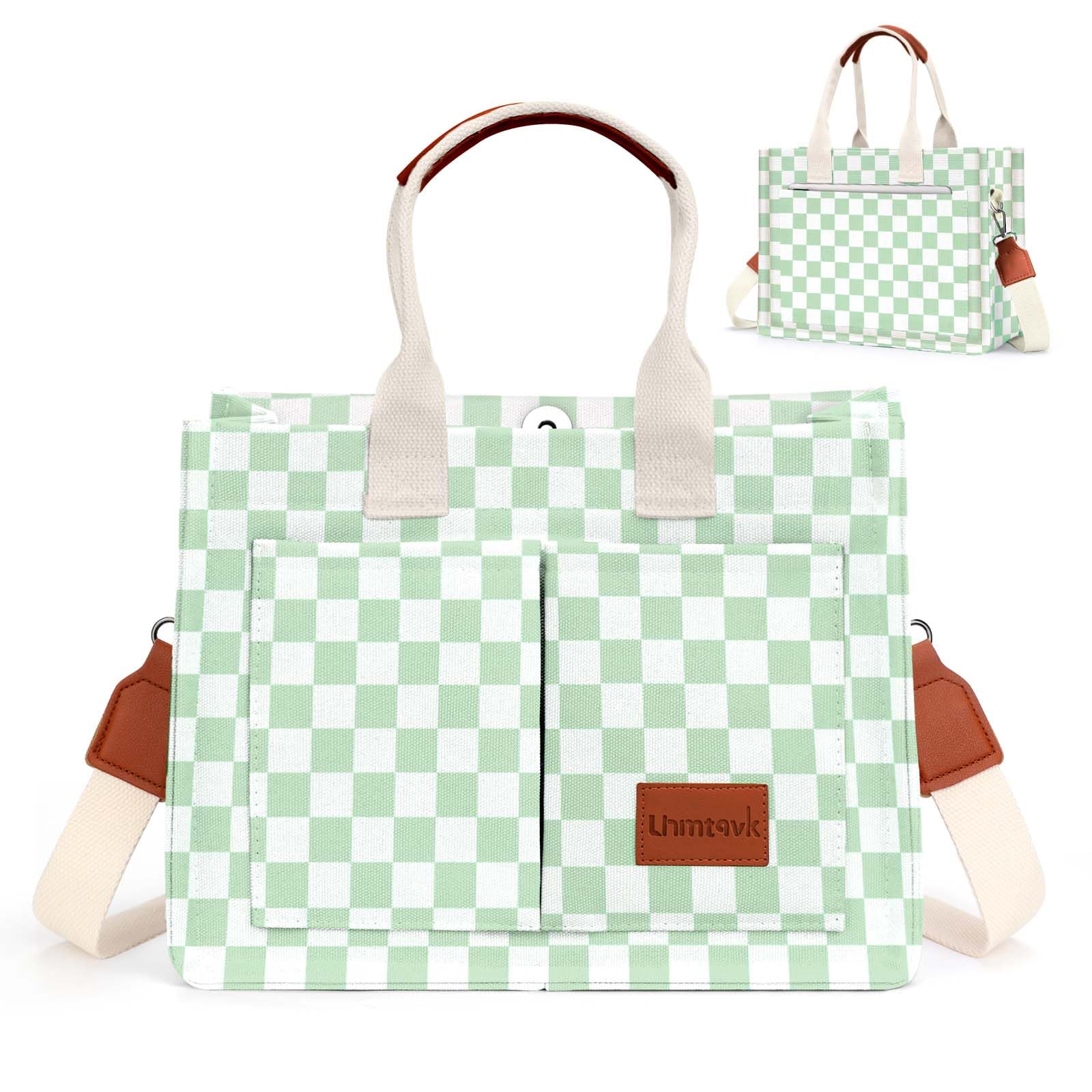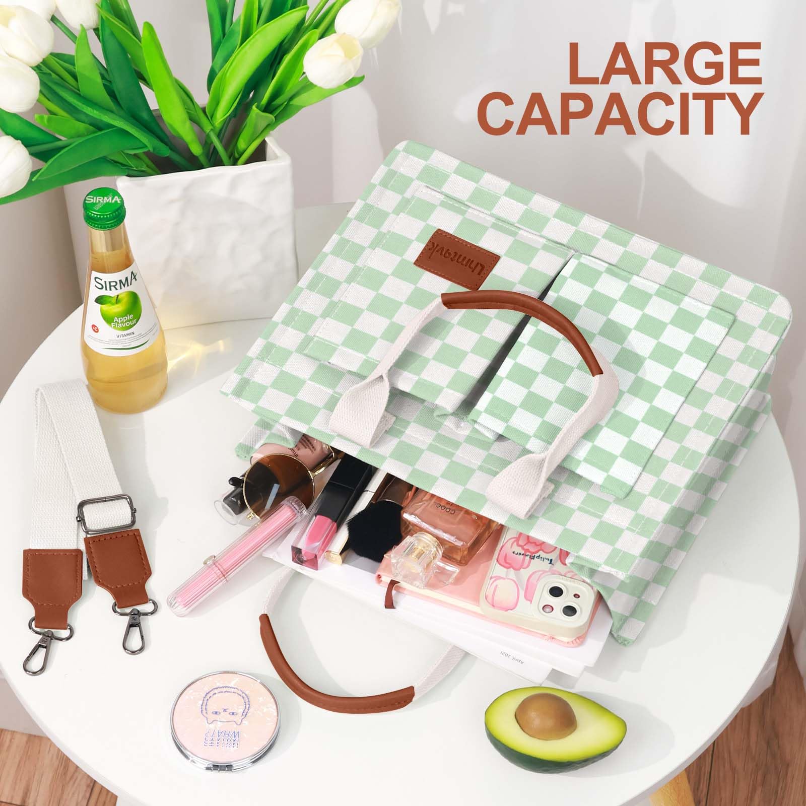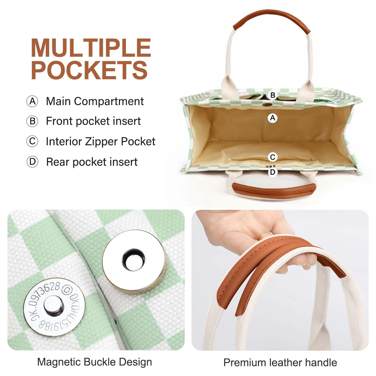 - [Multiple Pockets & Large Capacity] This work bags for women has a total of 5 pockets, enough to store your belongings. The two front pockets of the canvas tote bag can hold mobile phones, power bank, sunglasses, and lipstick. A large pocket can hold iPad, books, cosmetics, and folding umbrellas. An interior zippered pocket holds keys, wallet, and cards. One back pocket can hold books, tissues, and iPad.