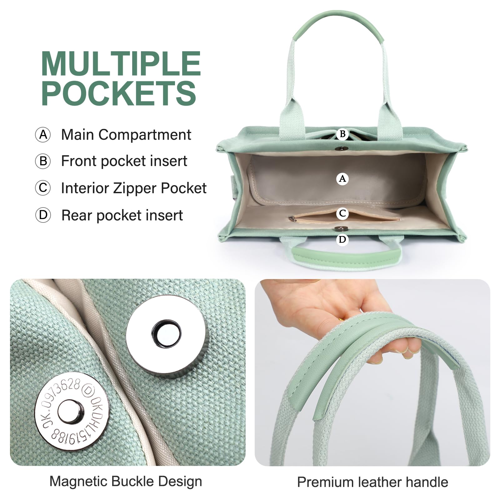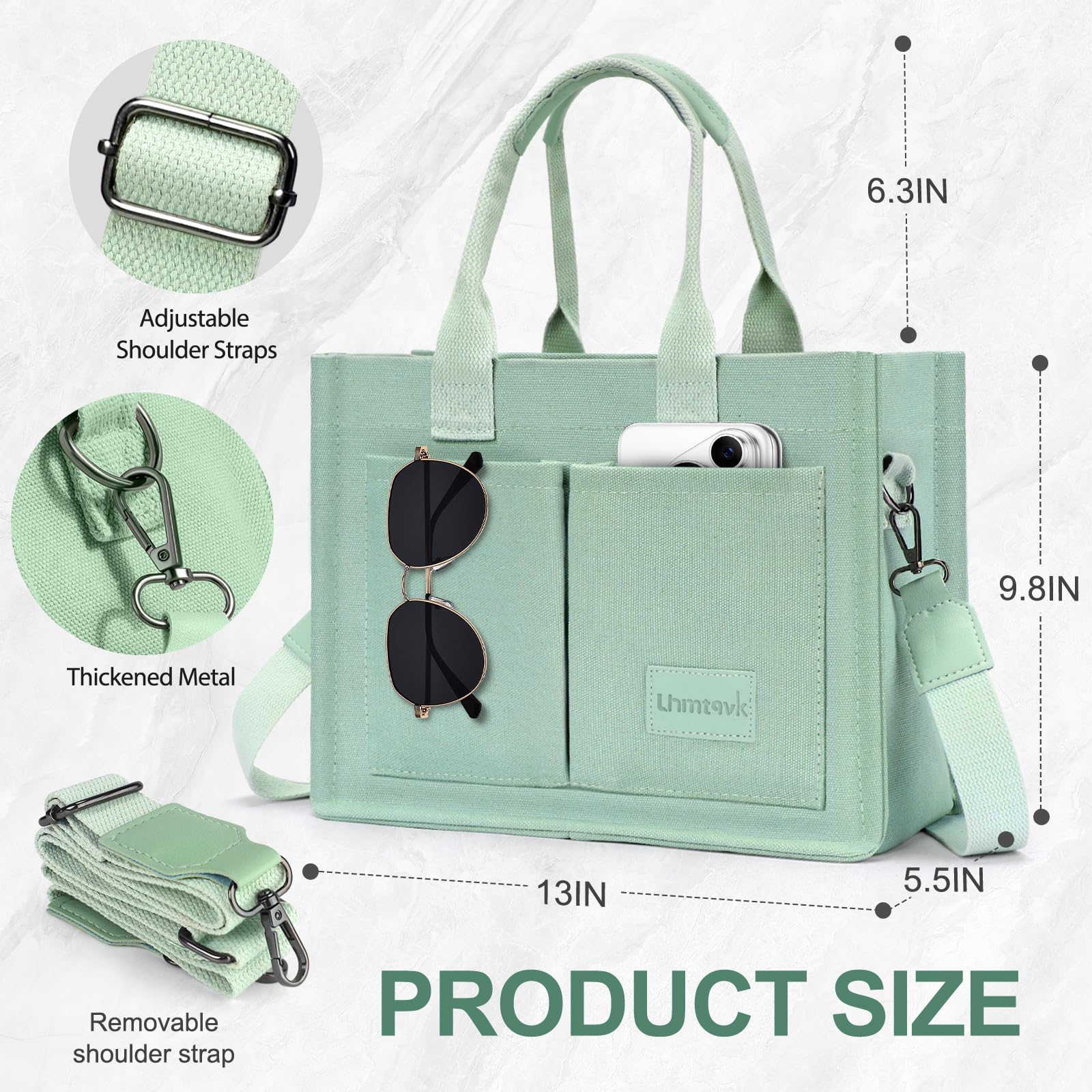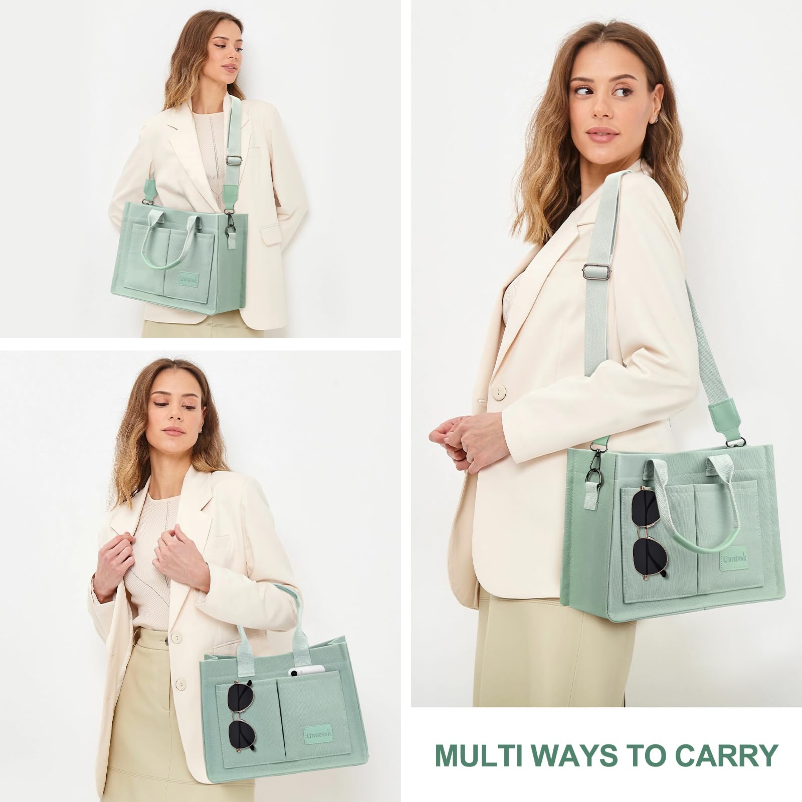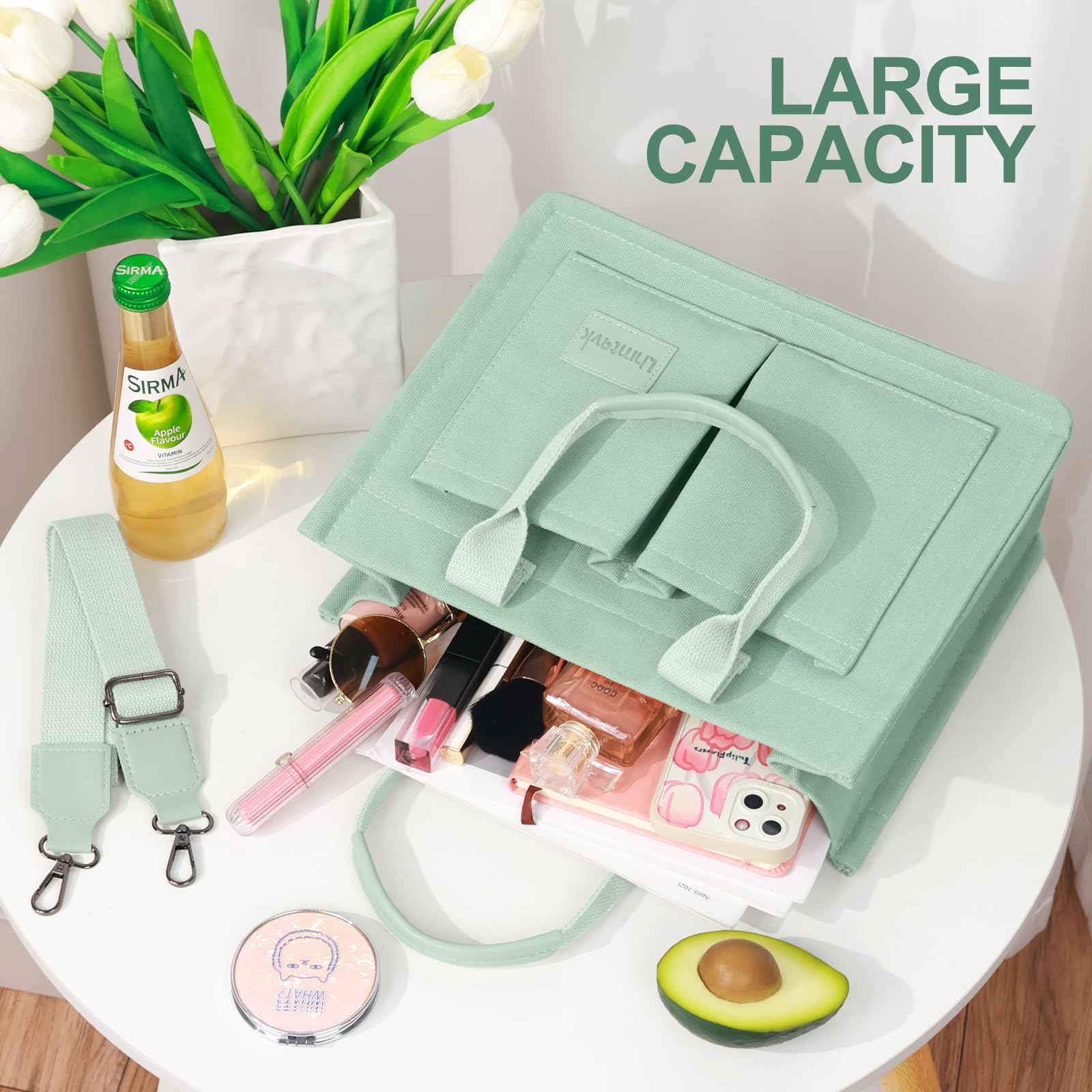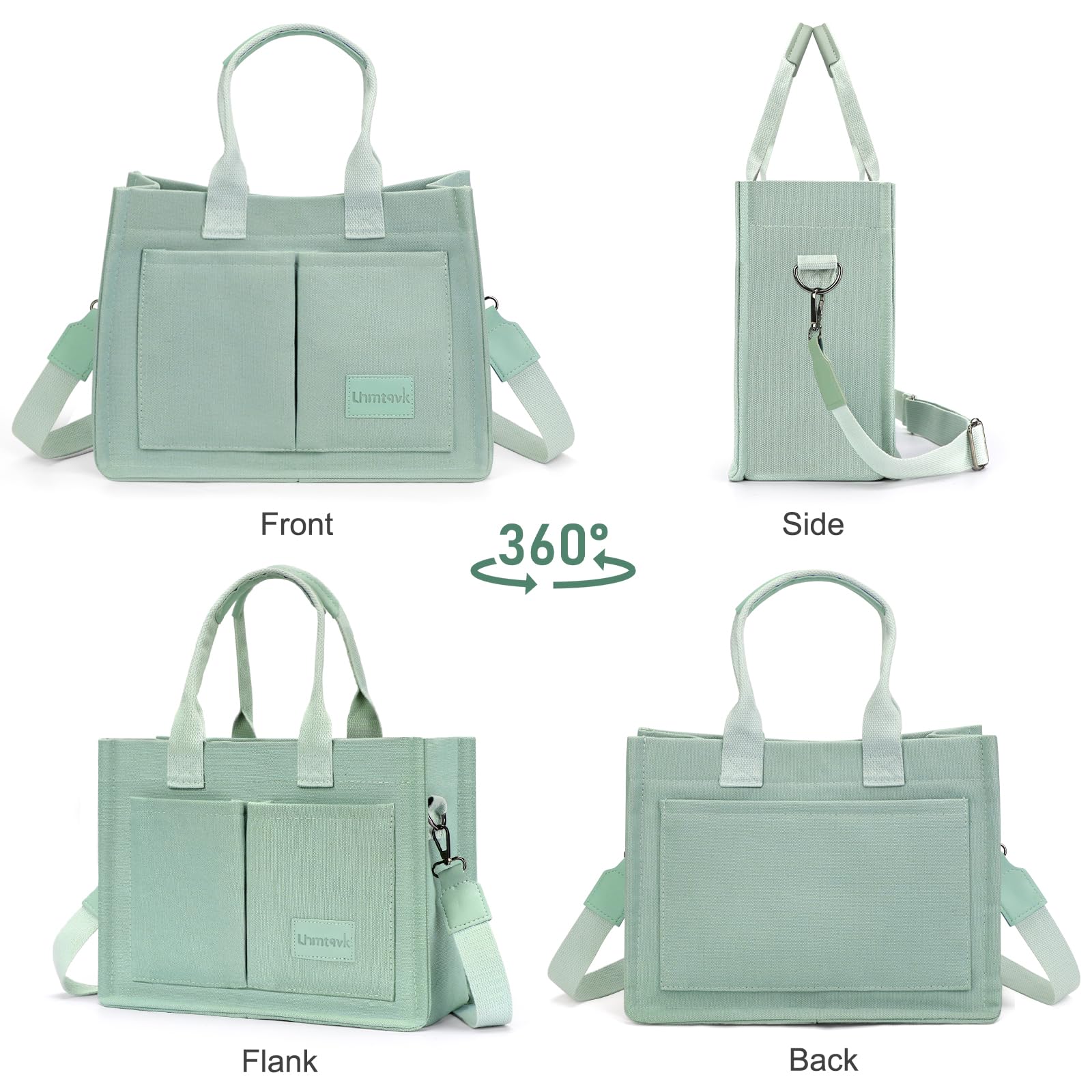 - [Multiple Pockets & Large Capacity] This work bags for women has a total of 5 pockets, enough to store your belongings. The two front pockets of the canvas tote bag can hold mobile phones, power bank, sunglasses, and lipstick. A large pocket can hold iPad, books, cosmetics, and folding umbrellas. An interior zippered pocket holds keys, wallet, and cards. One back pocket can hold books, tissues, and iPad.