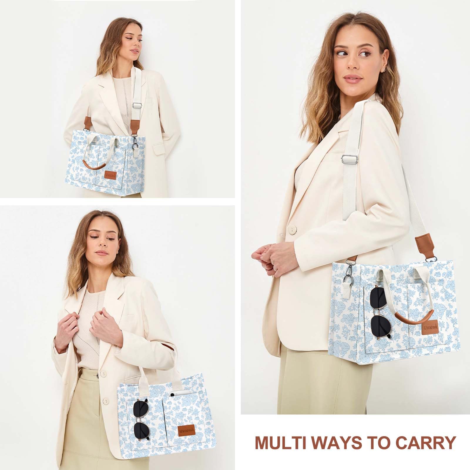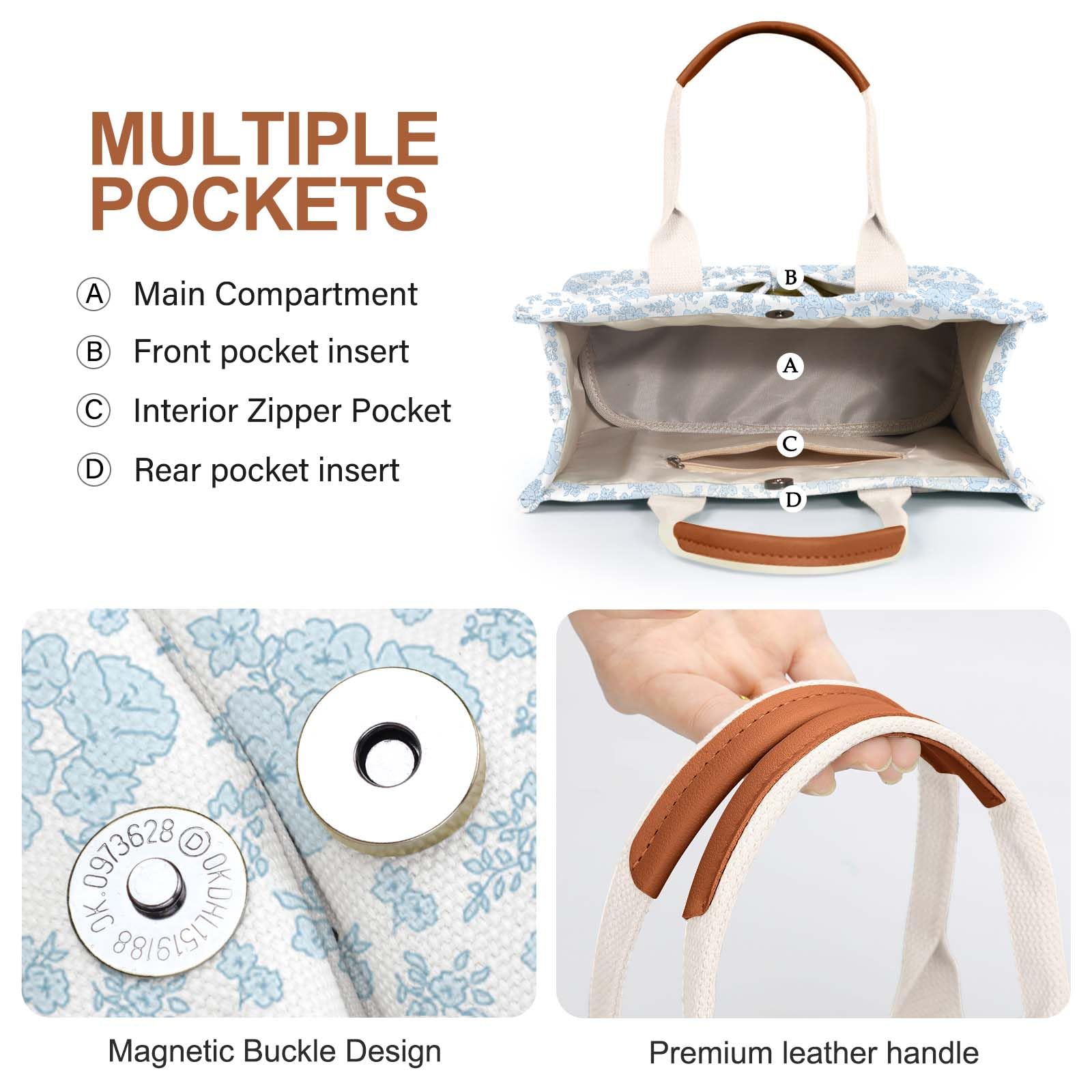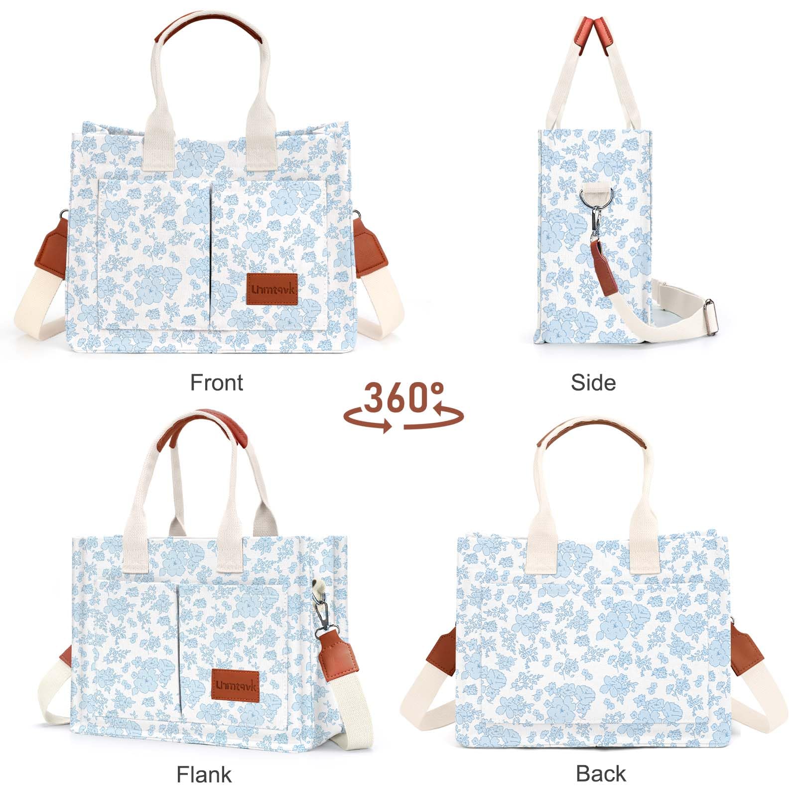 - [Multiple Pockets & Large Capacity] This work bags for women has a total of 5 pockets, enough to store your belongings. The two front pockets of the canvas tote bag can hold mobile phones, power bank, sunglasses, and lipstick. A large pocket can hold iPad, books, cosmetics, and folding umbrellas. An interior zippered pocket holds keys, wallet, and cards. One back pocket can hold books, tissues, and iPad.