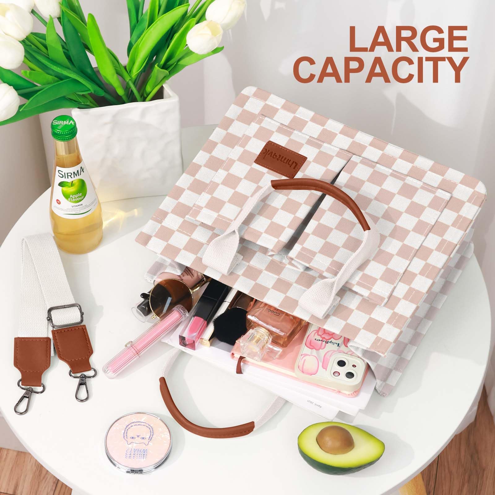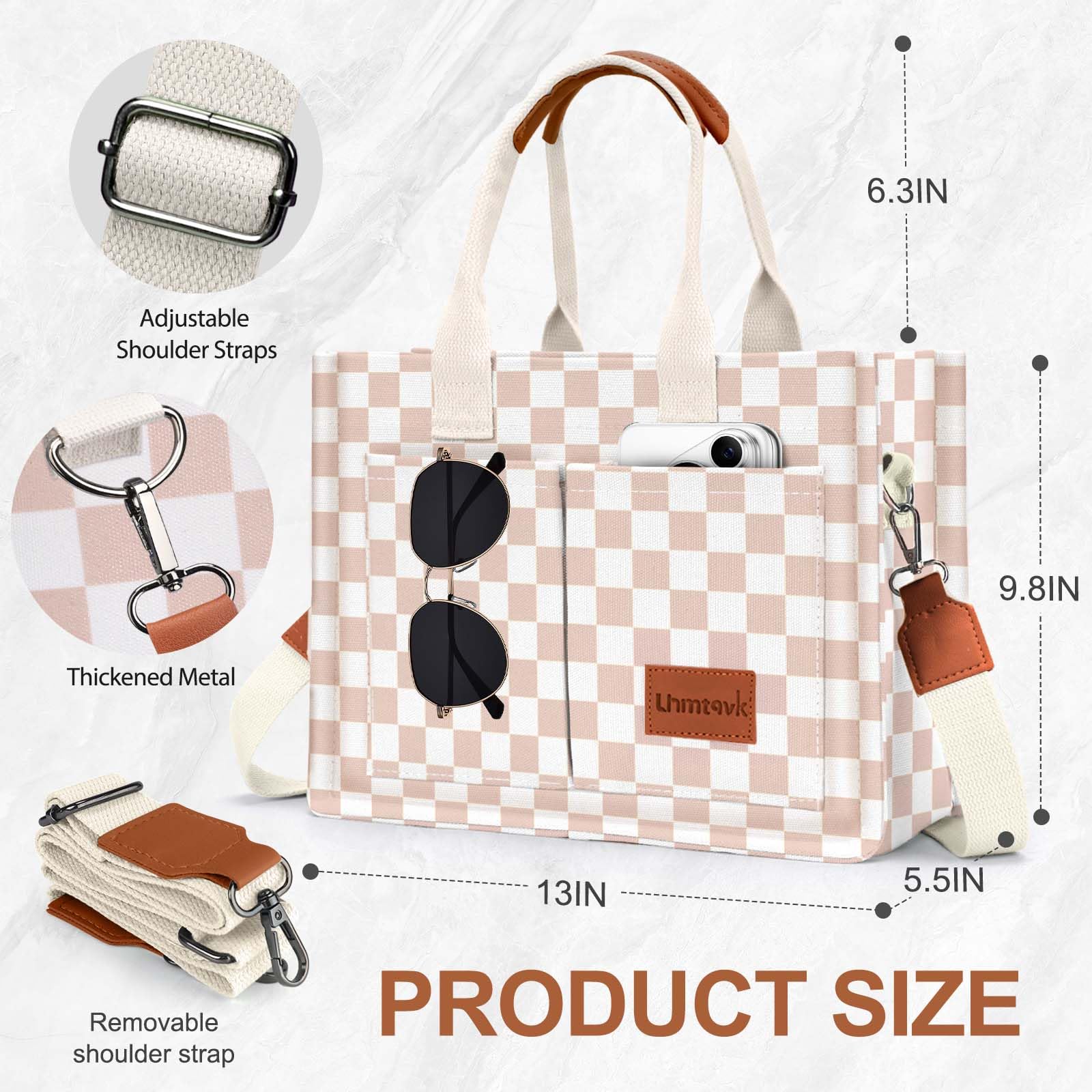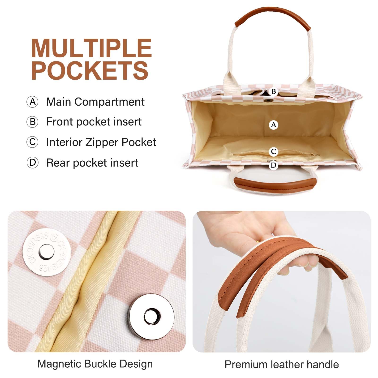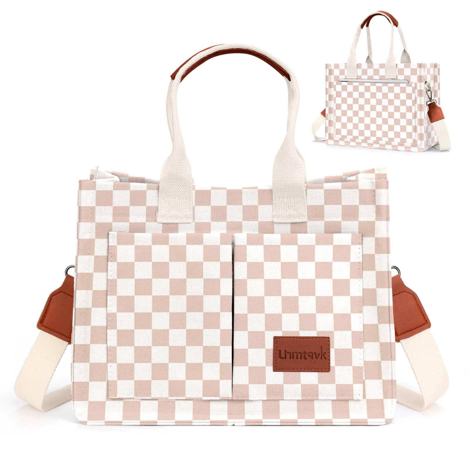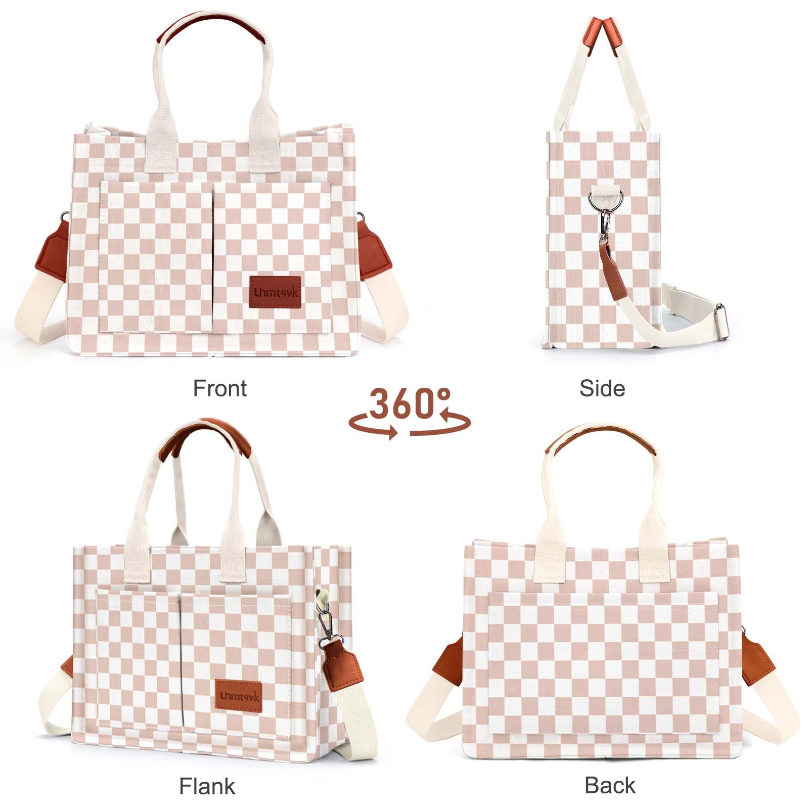- [Multiple Pockets & Large Capacity] This work bags for women has a total of 5 pockets, enough to store your belongings. The two front pockets of the canvas tote bag can hold mobile phones, power bank, sunglasses, and lipstick. A large pocket can hold iPad, books, cosmetics, and folding umbrellas. An interior zippered pocket holds keys, wallet, and cards. One back pocket can hold books, tissues, and iPad.