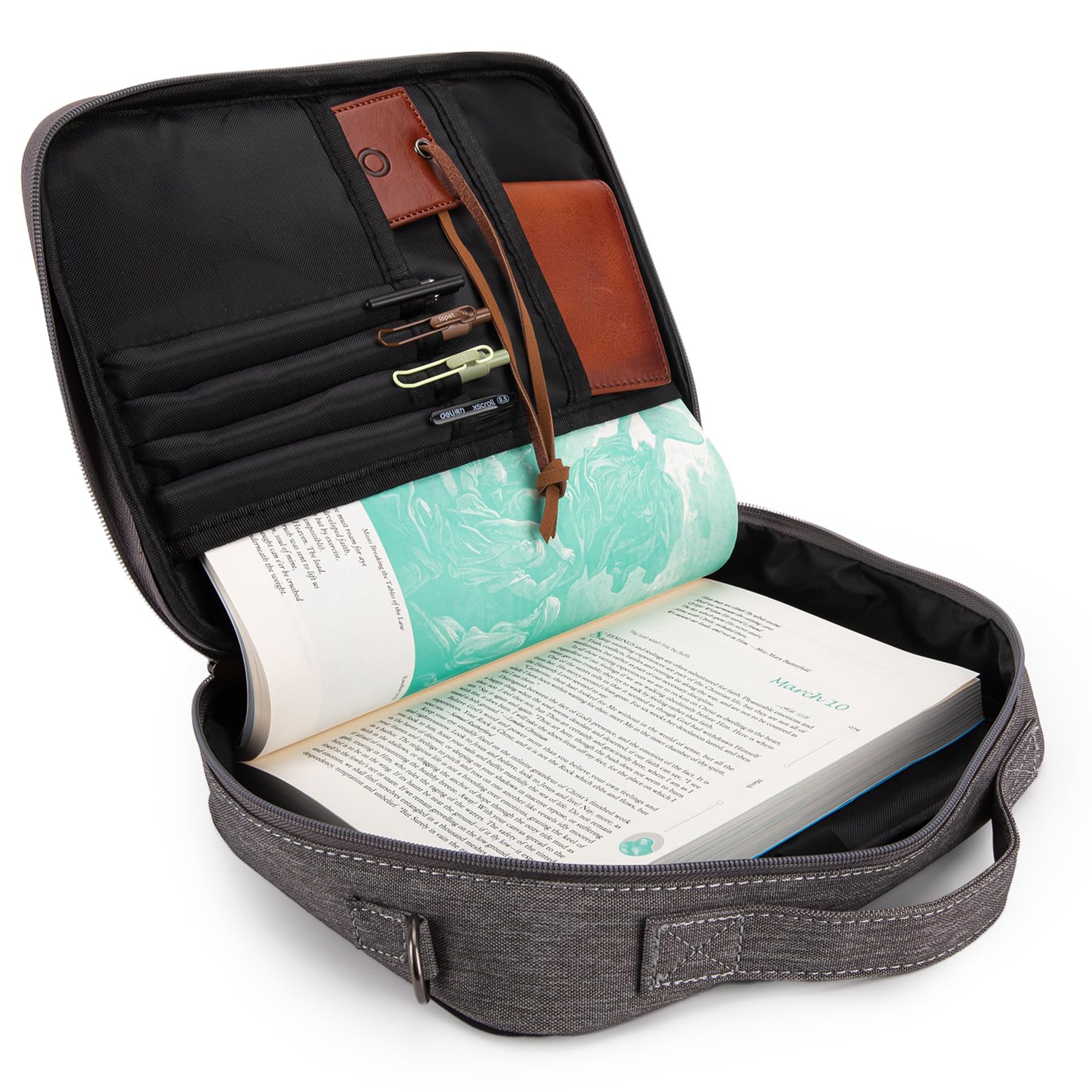 • Size: Specifically designed at 10.2″ x 8.2″ x 2.6″, this book cover fits most standard bibles and provides storage for additional items on the go