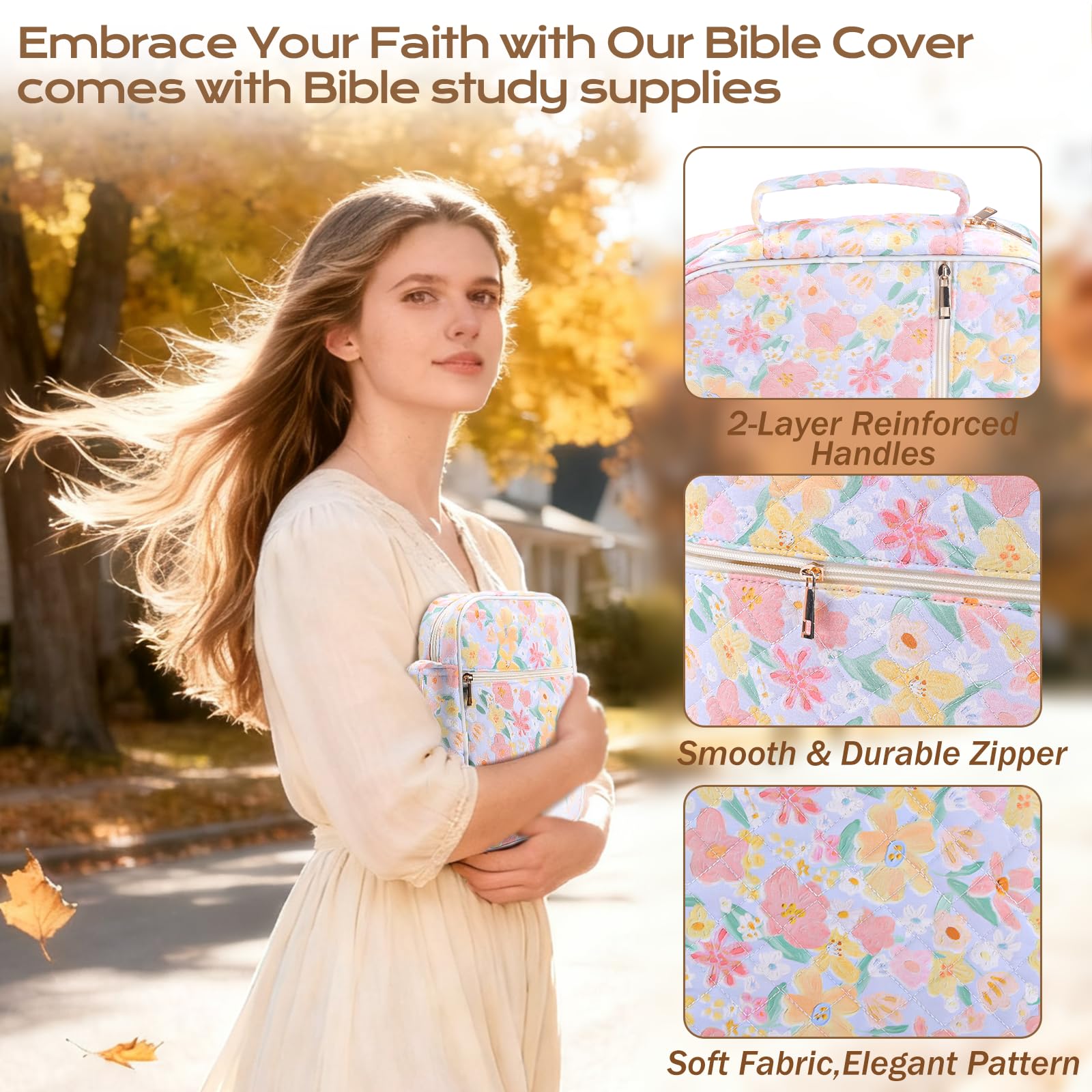 XKDOUS Large Bible Bags Floral Bible Cover with Durable Handle, Tabs, Pens, Study Supplies Carrier Organizer, Church Book Carrying Case Christmas Gifts for Women