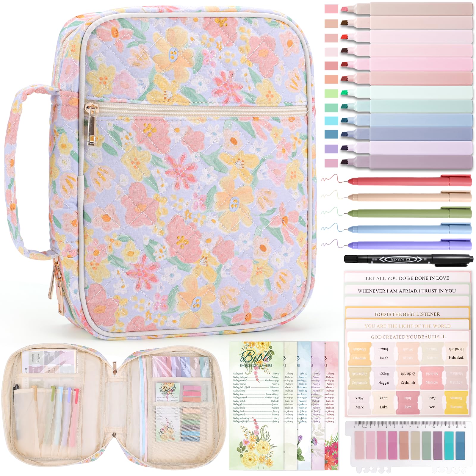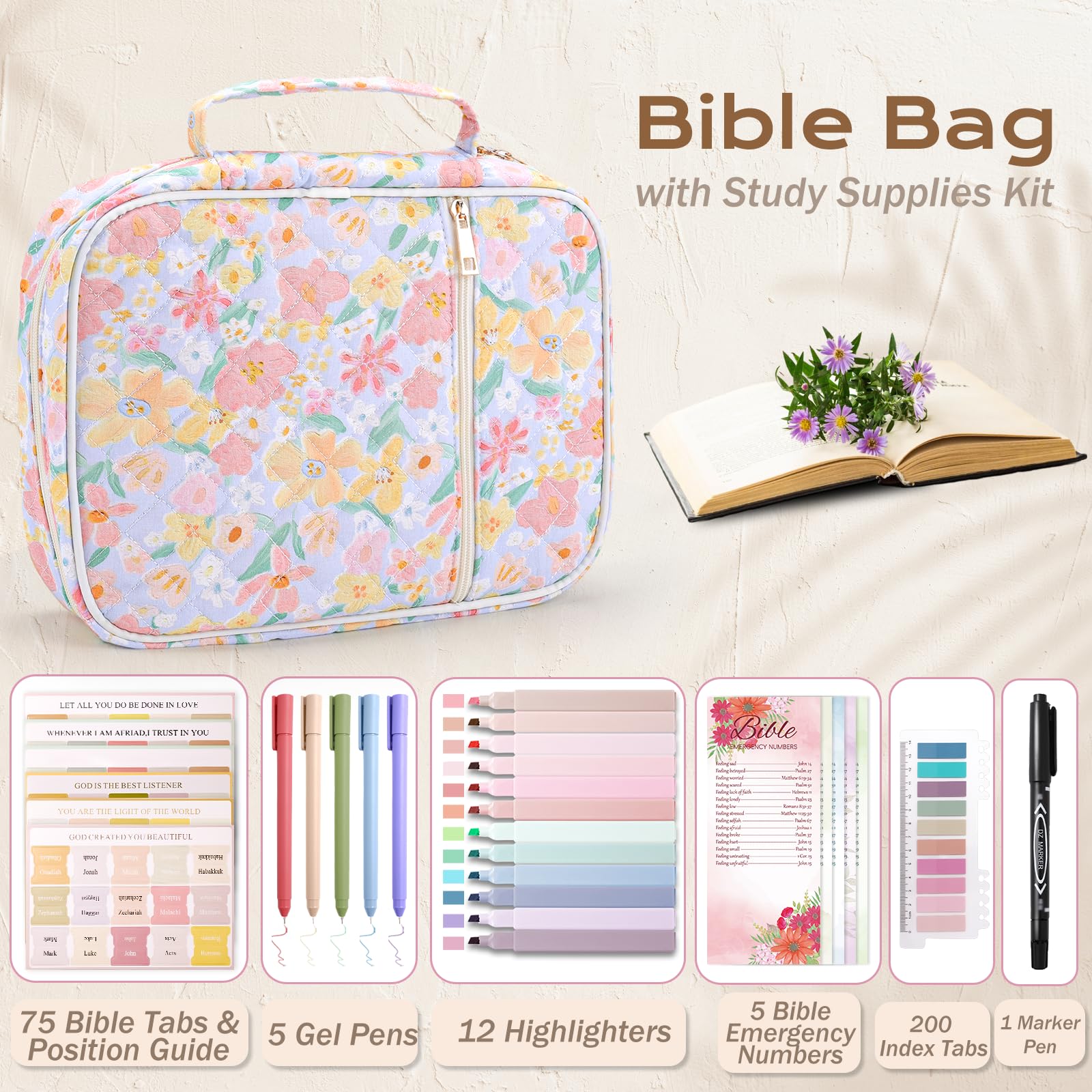 • Included Study Kits: The Bible bag comes with practical study accessories, including colorful pens, gel pens, Bible tabs, index tabs, and bookmarks. These items are ready to use, and supporting your Bible study well.